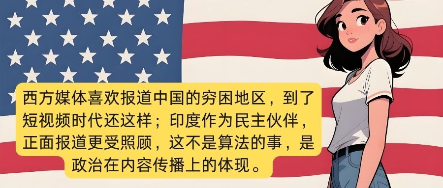 有位美国网友说:“西方媒体喜欢报道中国的穷困地区,到了短视频时代还这样。印度作为民主伙伴,正面报道更受照顾,这不是算法的事,是政治在内容传播上的体现。”