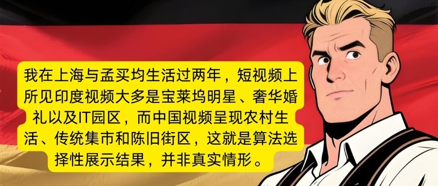 一位德国网友称,“我在上海与孟买均生活过两年,短视频上所见印度视频大多是宝莱坞明星、奢华婚礼以及IT园区,而中国视频呈现农村生活、传统集市和陈旧街区,这就是算法选择性展示结果,并非真实情形。”