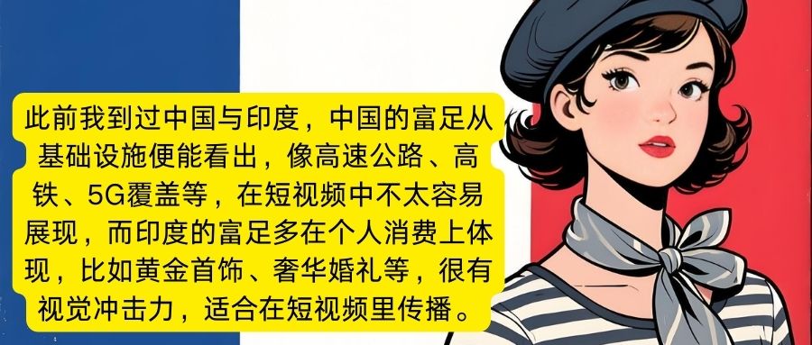 一位法国网友也表示,此前我到过中国与印度,中国的富足从基础设施便能看出,像高速公路、高铁、5G覆盖等,在短视频中不太容易展现,而印度的富足多在个人消费上体现,比如黄金首饰、奢华婚礼等,很有视觉冲击力,适合在短视频里传播。