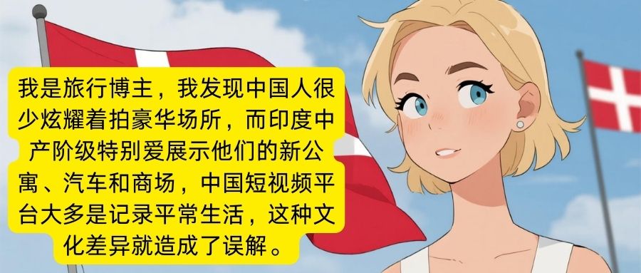 一位丹麦博主说:“我是旅行博主,我发现中国人很少炫耀着拍豪华场所,而印度中产阶级特别爱展示他们的新公寓、汽车和商场,中国短视频平台大多是记录平常生活,这种文化差异就造成了误解。”