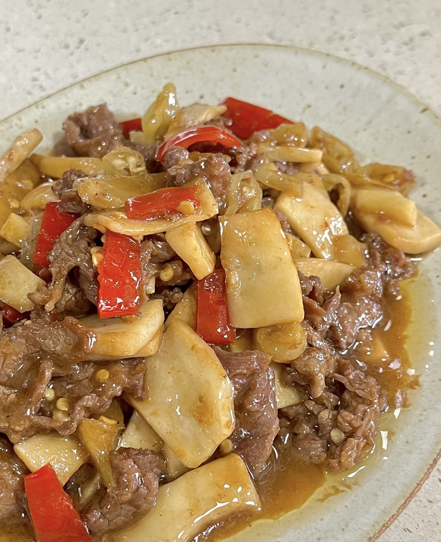 这样,一道香香辣辣又带着清甜的白萝卜炒五花肉就完成了,绝对是下饭的绝佳选择。