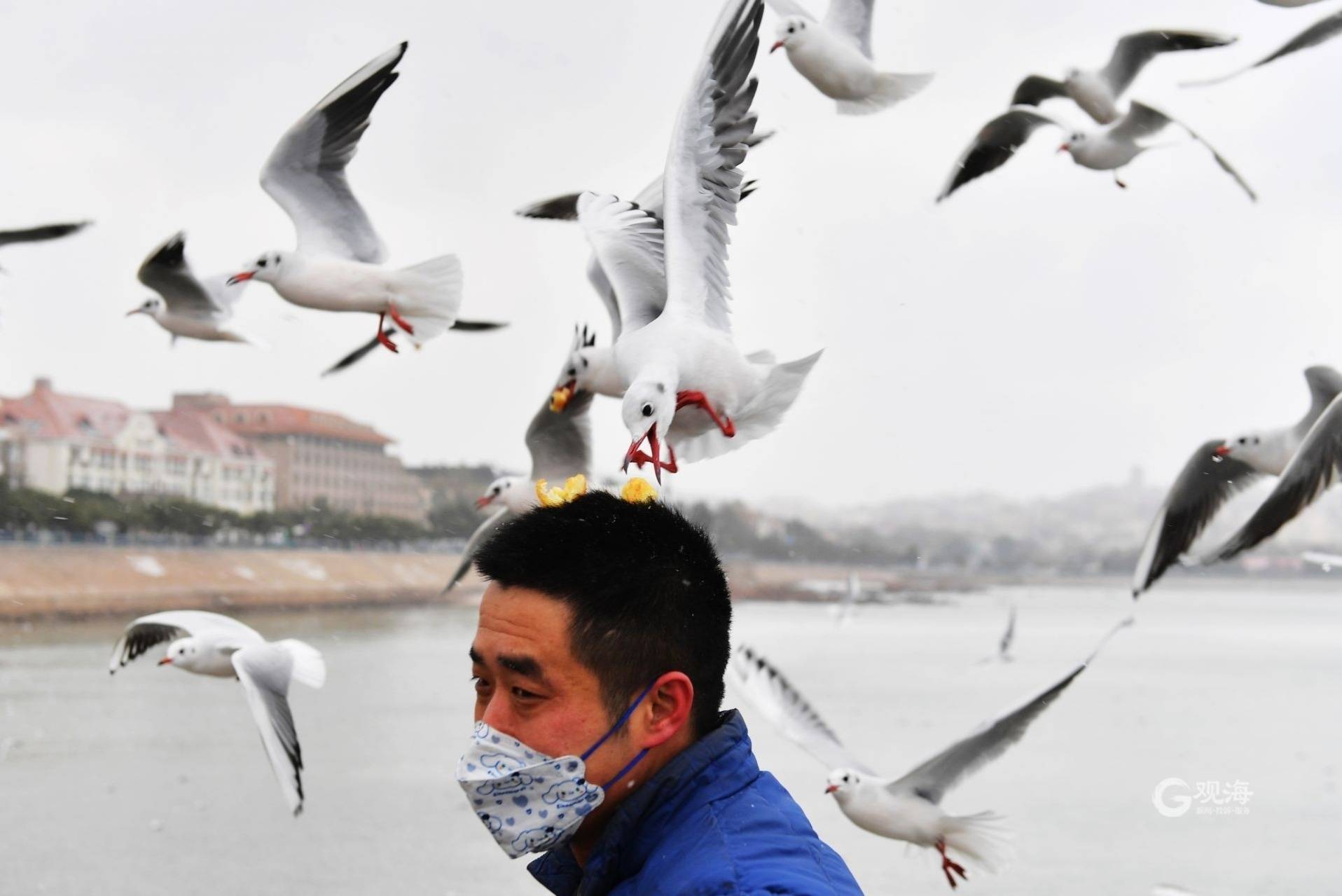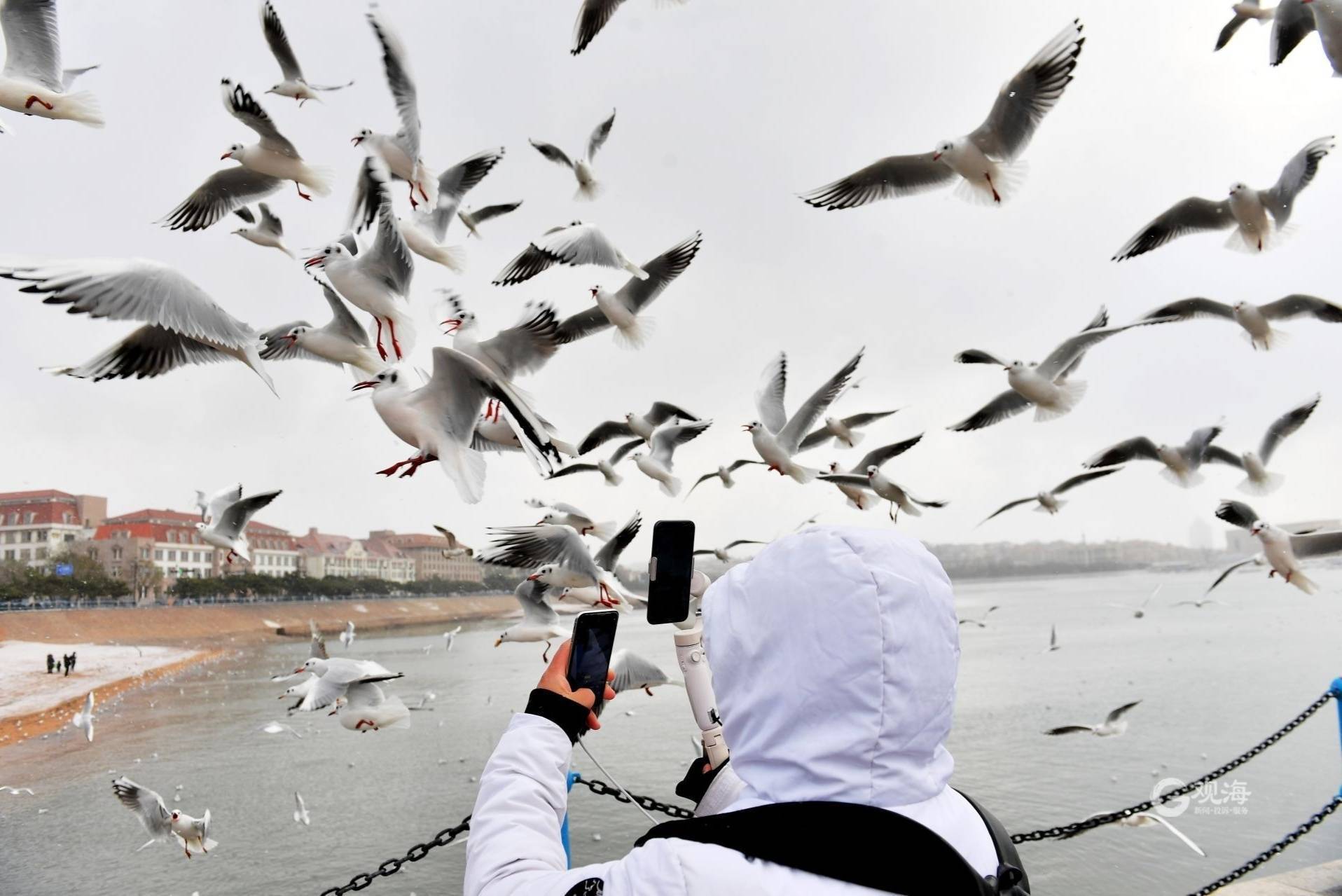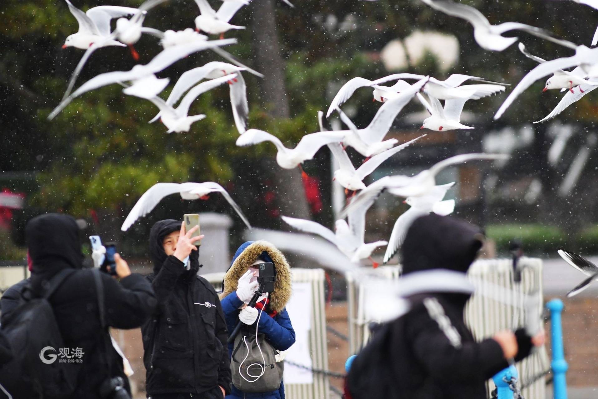 近日,青岛市迎来入冬首场降雪,游客在栈桥景区喂食海鸥、人鸟嬉戏,绘就一幅生态和谐的自然景观画卷。(观海特约摄影师 王海滨 摄 责任编辑 樊蓉)