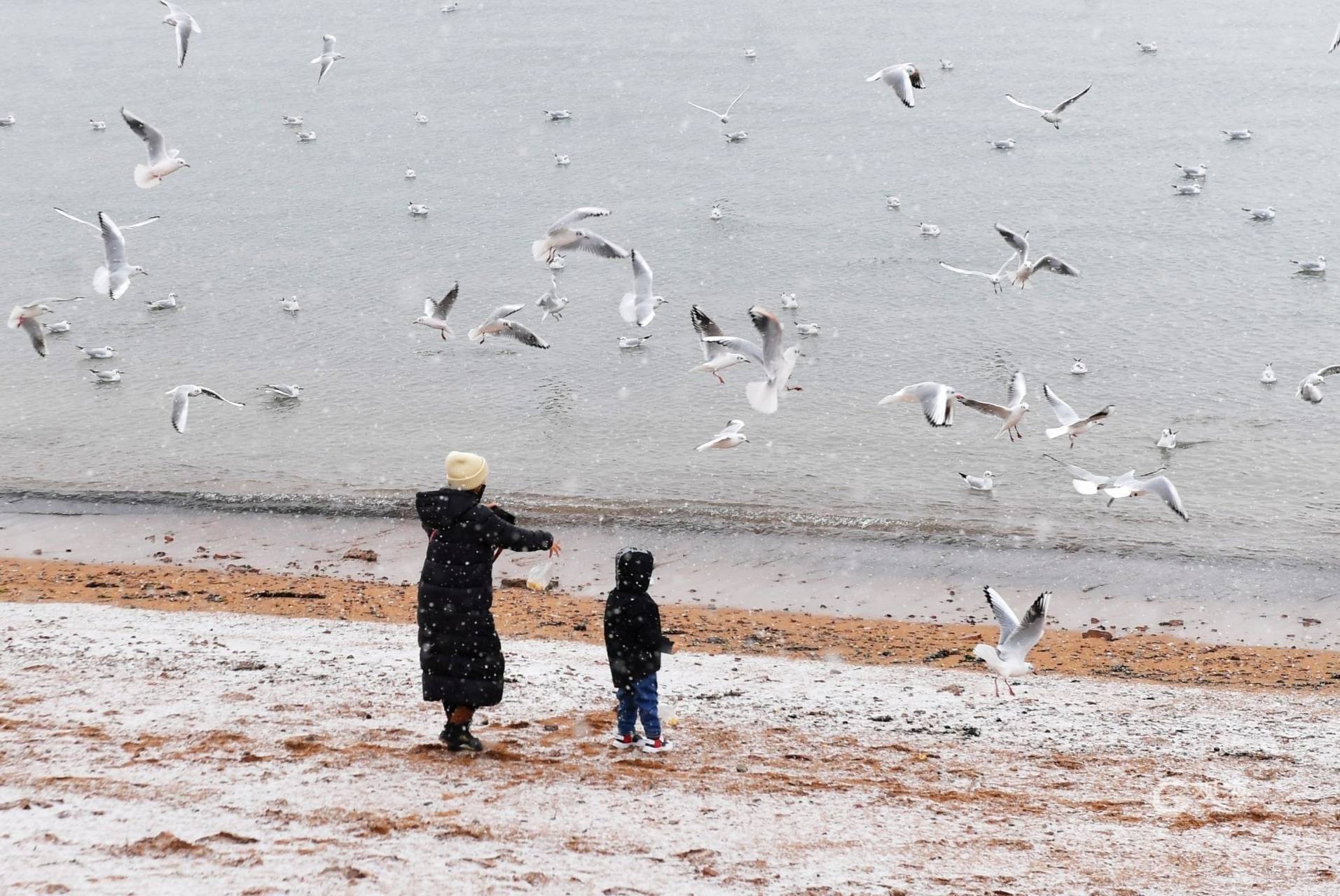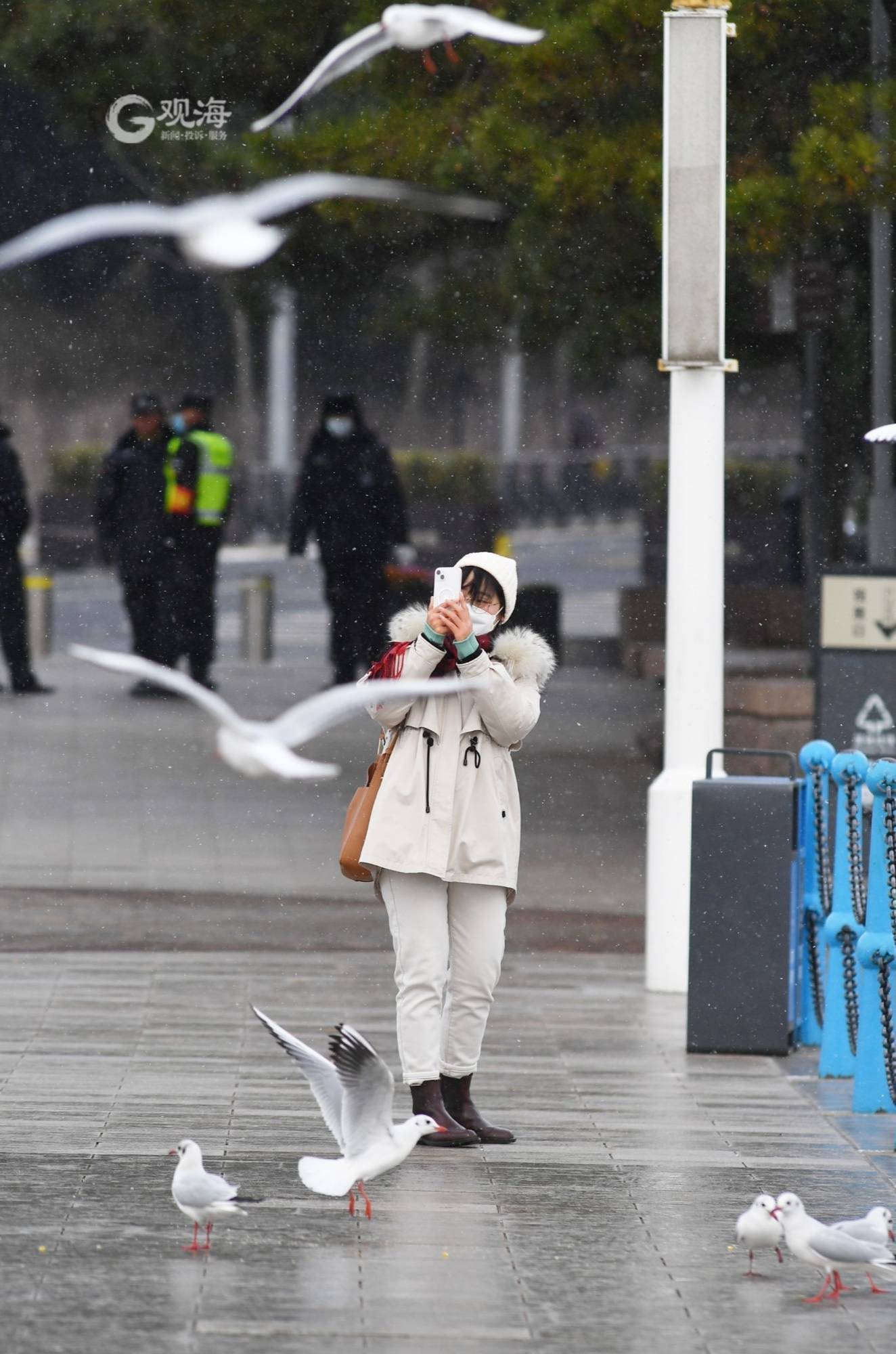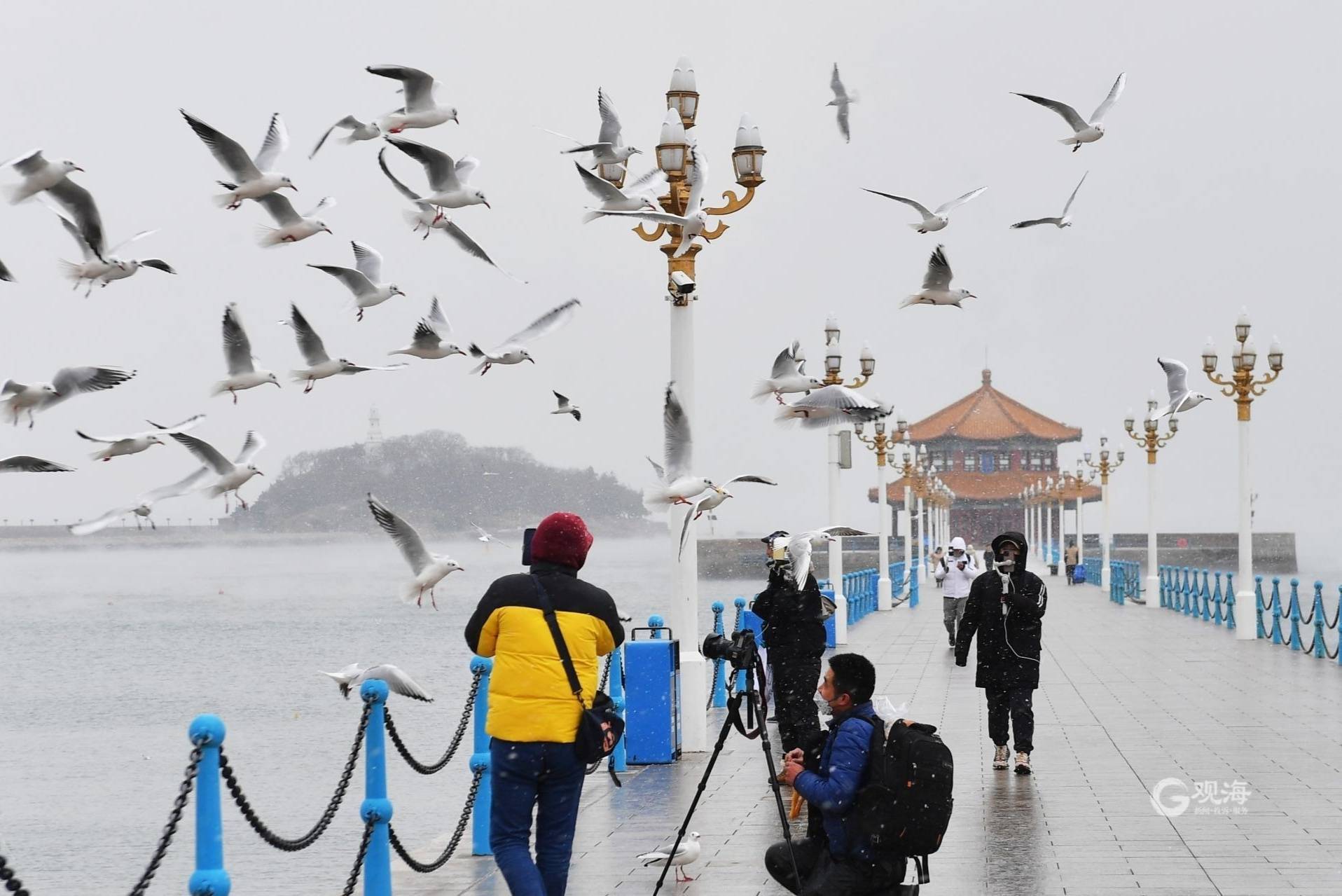 近日,青岛市迎来入冬首场降雪,游客在栈桥景区喂食海鸥、人鸟嬉戏,绘就一幅生态和谐的自然景观画卷。(观海特约摄影师 王海滨 摄 责任编辑 樊蓉)