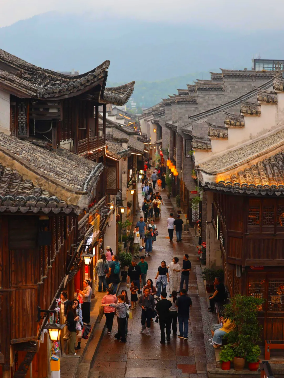 浙江第一古街,全长1.8km,夜生活丰富。团建玩法:古城剧本杀“戚家军密码”、临海糟羹打卡、城墙夜游、巾山塔灯光秀。秋天桂花酒香飘半条街。