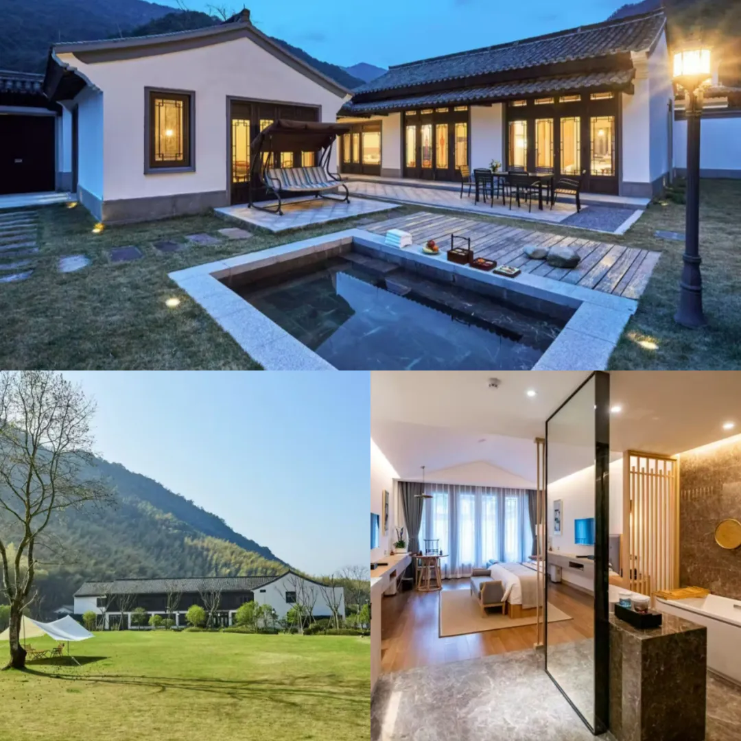 隐匿在天台山脉,周围被20万亩森林环抱,拓展草坪+温泉酒店一站式。中式庭院别墅,白天森林大草坪拓展团建,晚上温泉泡汤解乏。秋天泡池45℃,富含偏硅酸、氟等20多种矿物质,天然真温泉。