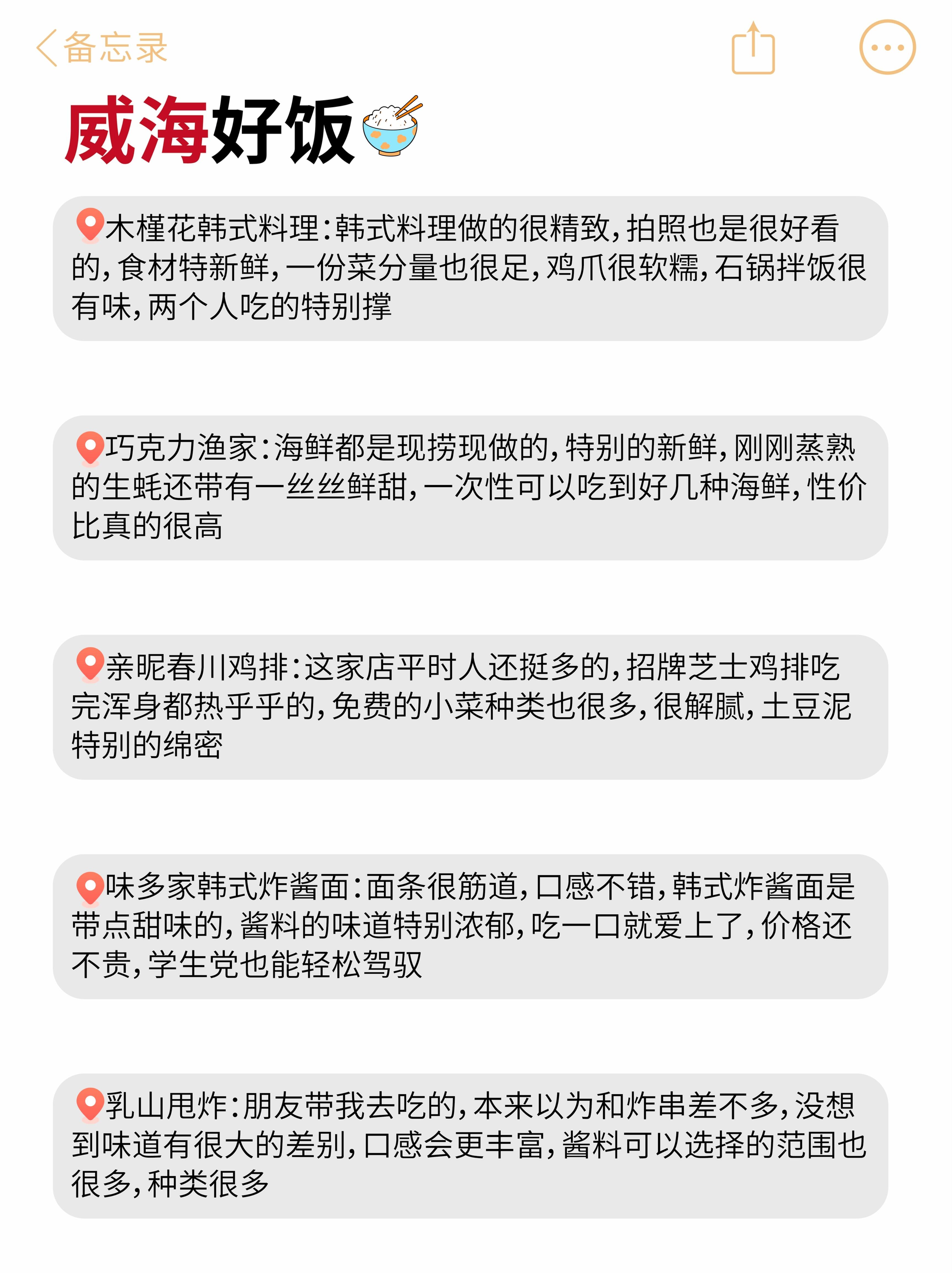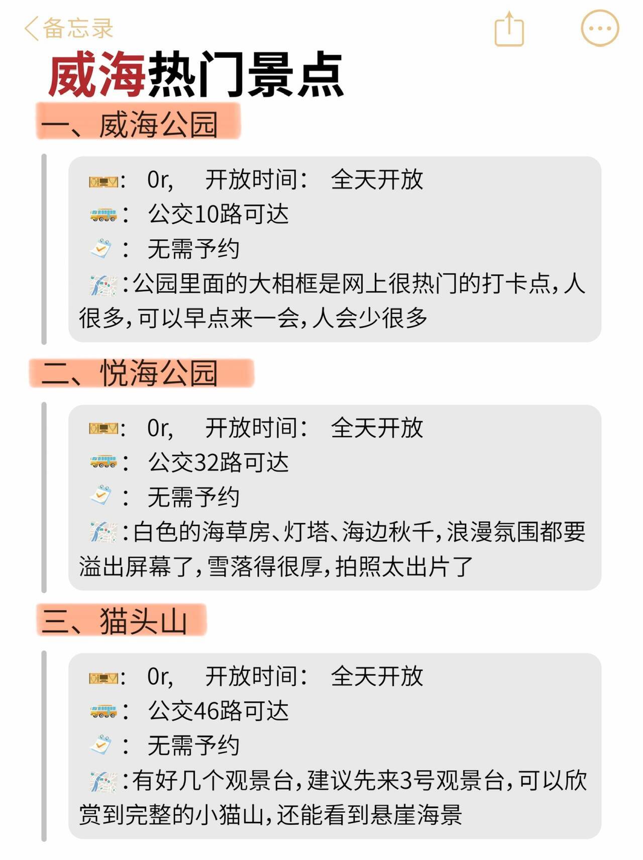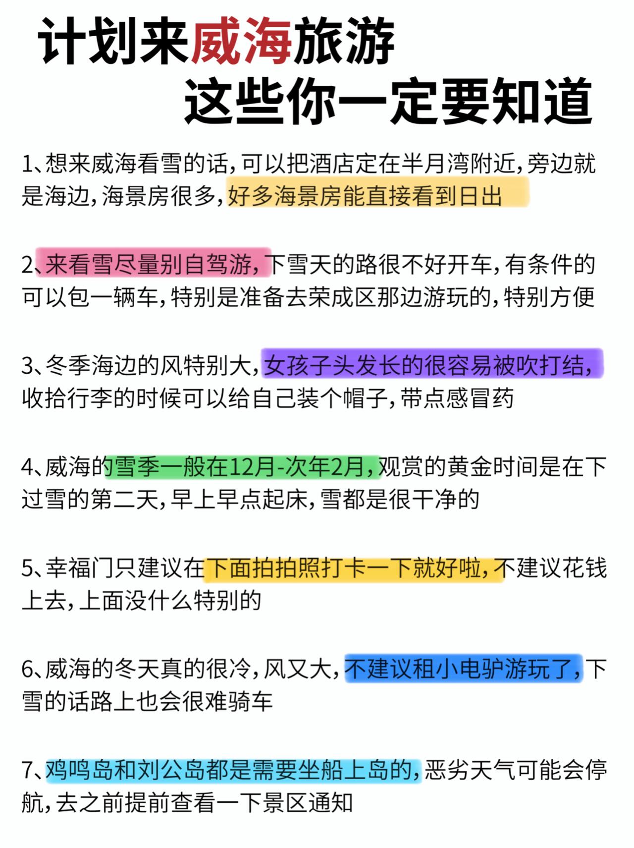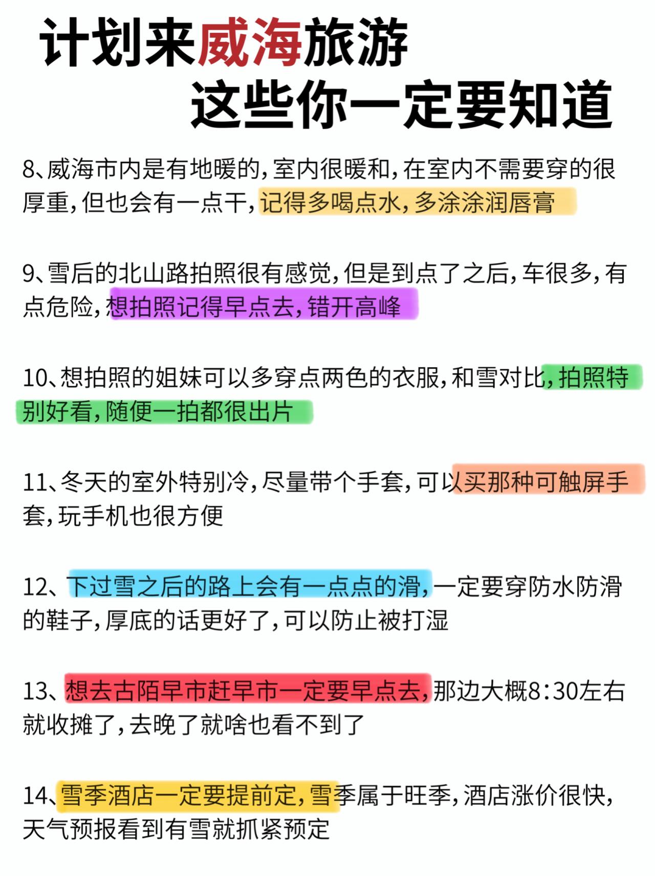 第一天先在酒店🏨附近玩了玩,火炬八街去晚了,都是人,没有拍出人生照片,大家要是想拍照📷,还是尽量早点去,后来又去了葡萄滩,这里的人没那么多,下过雪之后像是冰河世纪一样,很美😍,拍照好好看😻,晚上迫不及待的去品尝了威海的海鲜,我们选择的是巧克力渔家🐟,蛮火的,到那还等了一会,但是口味很值得,都是现捞现做的,一下能吃到好多种海鲜🦐第二天游览了几个海边公园⛲️,景色都各有各的美,喜欢拍照的姐妹可以直接去悦海公园,💟白色的灯塔和海边的秋千,拍照都特别好看🤩,晚上去韩乐坊吃了顿韩餐🍝,很正宗,老板是韩国人,我们还和他聊了几句💬
