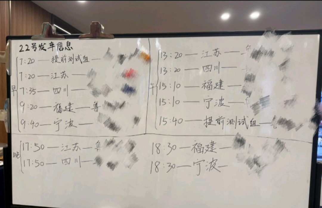 11月22四新赛季CBA体测正式开始,有媒体人在社媒曝光了体测当天的时间安排,具体发车时间见上方截图。体测安排以四川男篮为例,早上7:35 发车,8:00-8:25 动态,8:25-8:50 静态,9:00-9:25 力-深蹲,9:25-9:50 力-卧推,14:00-14:30 投-定点,14:30-15:00 投-五角,15:10-15:40 选-速耐,18:30-19:10 选-3分半。其余空余的时间是其他三个队在测试,这个安排确实很紧张,球员必须在一天之内完成所有体测项目,而且今年的体测实行末尾淘汰制,每个人都得争取最好成绩。