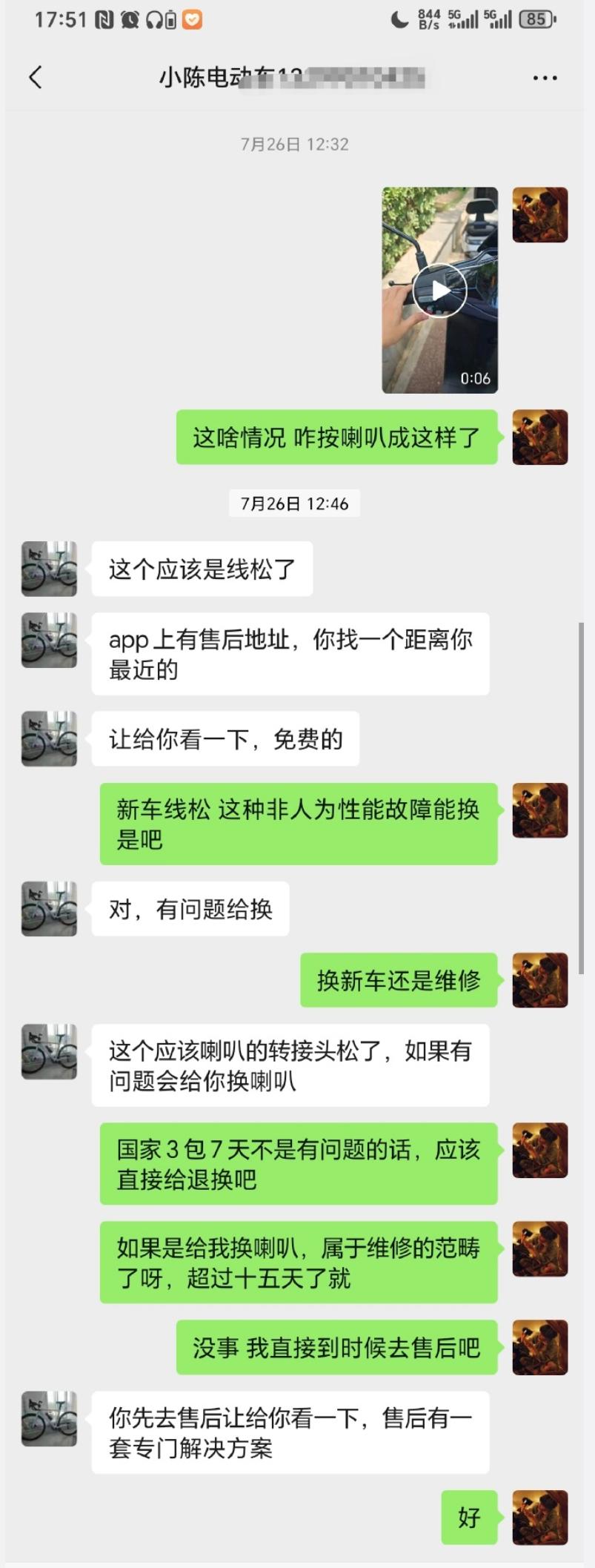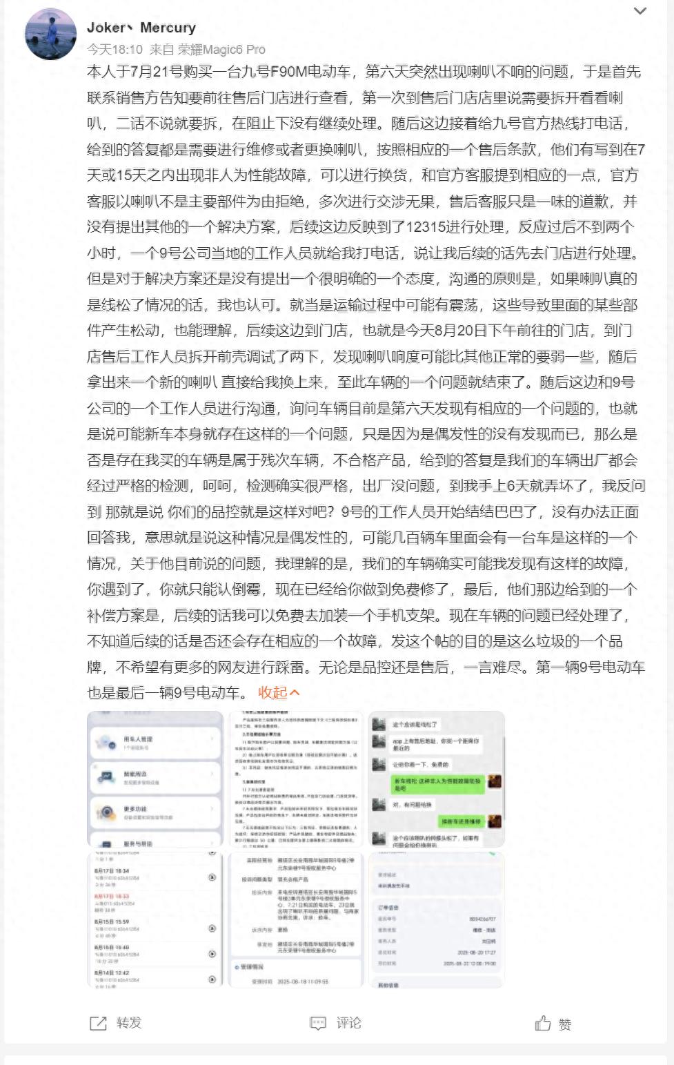 其表示于7月21号购买一台九号F90M电动车,第六天突然出现喇叭不响的问题,于是首先联系销售方告知要前往售后门店进行查看,第一次到售后门店店里说需要拆开看看喇叭,二话不说就要拆,在阻止下没有继续处理。