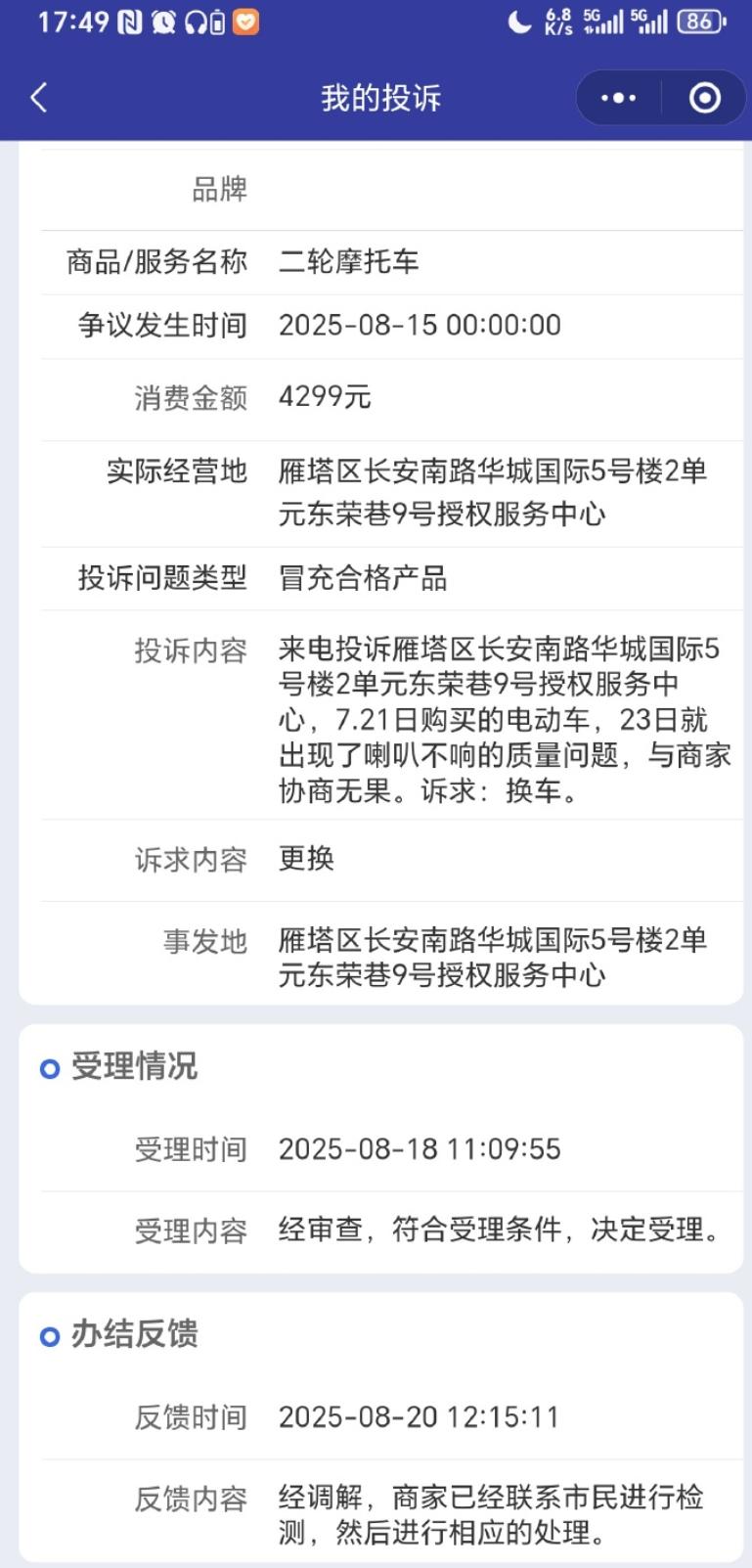 投诉后对于解决方案还是没有提出一个很明确的一个态度,沟通的原则是,如果喇叭真的是线松了情况的话,我也认可。就当是运输过程中可能有震荡,这些导致里面的某些部件产生松动,也能理解,后续这边到门店,也就是今天8月20日下午前往的门店,到门店售后工作人员拆开前壳调试了两下,发现喇叭响度可能比其他正常的要弱一些,随后拿出来一个新的喇叭 直接给我换上来,至此车辆的一个问题就结束了。