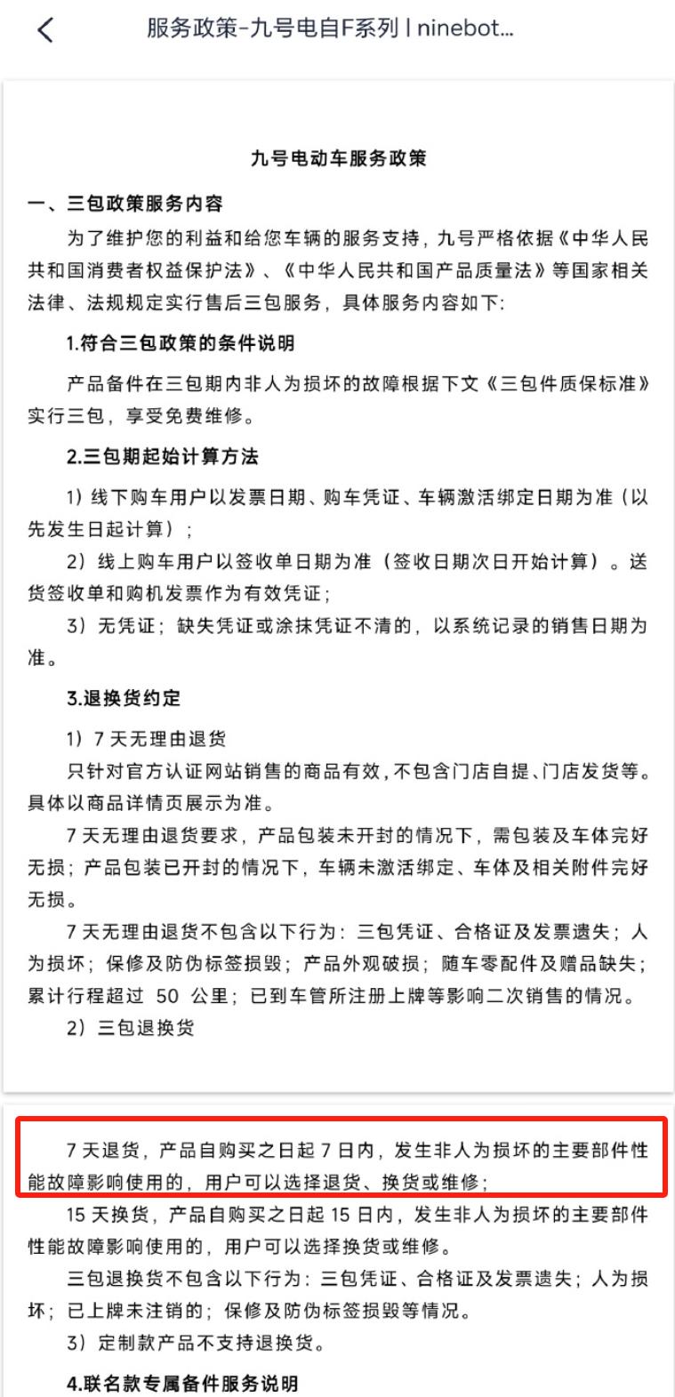 值接出行通过九号电动车服务政策看出,九号确实表示7天退货和15天换货,指的是主要部件性能故障。