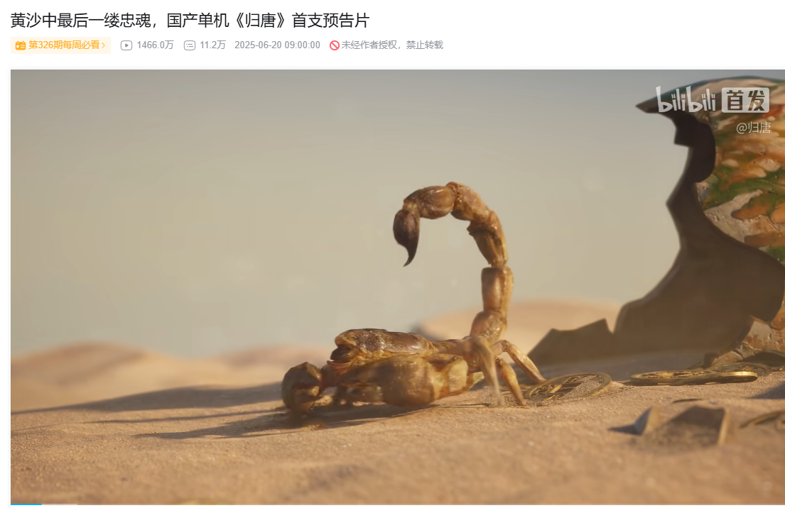 最令人惊艳的首先就是《归唐》场景和人物的建模,这精细度谁看了不说一声“绝”!预告片开头就是王炸,栩栩如生的蝎子、粒粒分明的沙子,还有尘土飞扬的物理效果,直接让这位制作人给出了满分的高评。特别是在沙漠上行走,沙土飞溅的效果更是称得上“技术奇迹”!