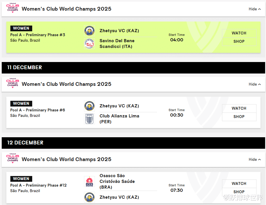 球队分在A组:巴西奥萨斯科女排、哈萨克斯坦杰特苏女排、意大利斯坎迪奇女排、秘鲁利马联盟女排,根据公布的赛程,杰特苏女排将迎来三场关键战役,北京时间具体如下: