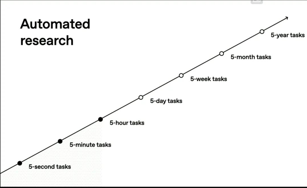 他们对AI能力进展的量化方式是看模型能完成的任务所需的时间跨度,从最初的几秒钟任务,到现在的五小时任务(比如在国际数学和信息学竞赛中击败顶尖选手),这个时间跨度正在快速延长。