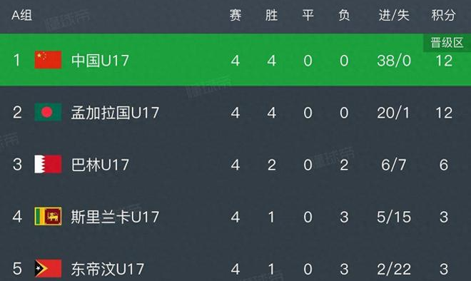 亚预赛开打至今,中国队4战全胜,积12分领跑;孟加拉国同样4战全胜积12分紧随其后。但两队的净胜球差距巨大:中国队进38球失0球,净胜球达到38个;孟加拉国进20球失1球,净胜球19个。中国队手握19个净胜球的巨大优势,这意味着末轮直接对话,中国队只要打平就能以小组第一身份出线。
