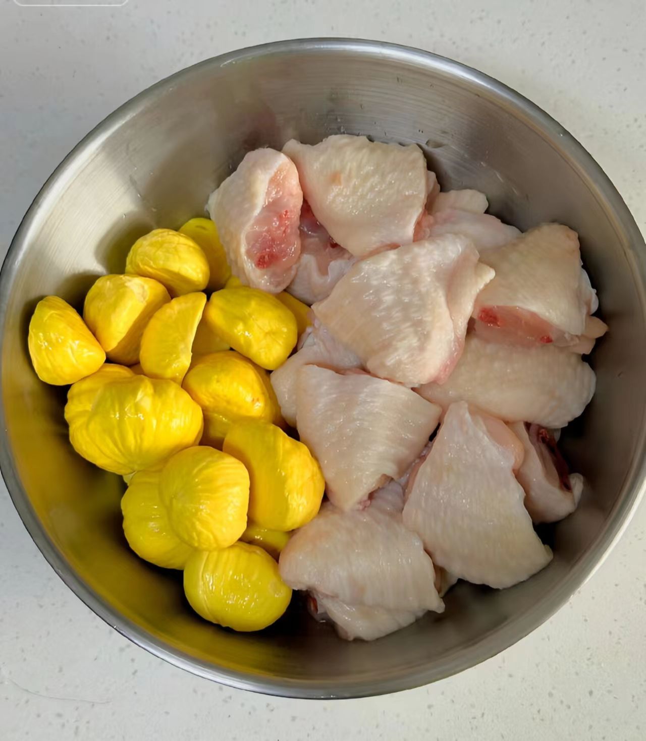买菜先过五关斩六将。板栗挑“笑口常开”型,壳裂口、颜色深棕,拿手里沉甸甸的,这种仁儿最饱满。懒人可以直接买剥好壳的“栗子仁”,但想省钱就自己回家开刀。秘诀:栗子平放案板,刀背轻轻一磕,壳裂后扔热水里煮 3 分钟,捞出来“内衣”一撕就掉,像给栗子做 SPA,光溜溜超治愈。鸡肉我选手枪腿,嫩过鸡胸、瘦过鸡翅,脂肪分布刚刚好,剁大块冷水下锅,加姜片料酒“飞个水”,煮出血沫后捞出,用温水冲净,别让冷水偷袭,否则肉瞬间变“木疙瘩”。