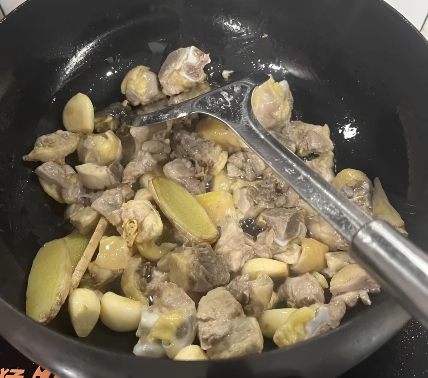 锅里倒一点点油,扔七八粒冰糖,小火慢慢“炒糖色”。糖先冒大泡再变小泡,颜色从浅黄蹦到琥珀,像夕阳掉进锅,这时候火速倒入鸡块,“呲啦”一声,糖液抱住鸡块翻滚,表面瞬间染上一层诱人焦糖色。注意别走神,糖色一过火就苦成中药,30秒决定成败。鸡肉均匀上色后,推到一边,空位下姜片、蒜瓣、八角、香叶,香料在热油里“滋啦”跳舞,香味像小精灵直往鼻腔里钻,此刻可以加1勺黄豆酱+1勺生抽+半勺老抽,酱香味“轰”地炸开,厨房秒变深夜食堂。
