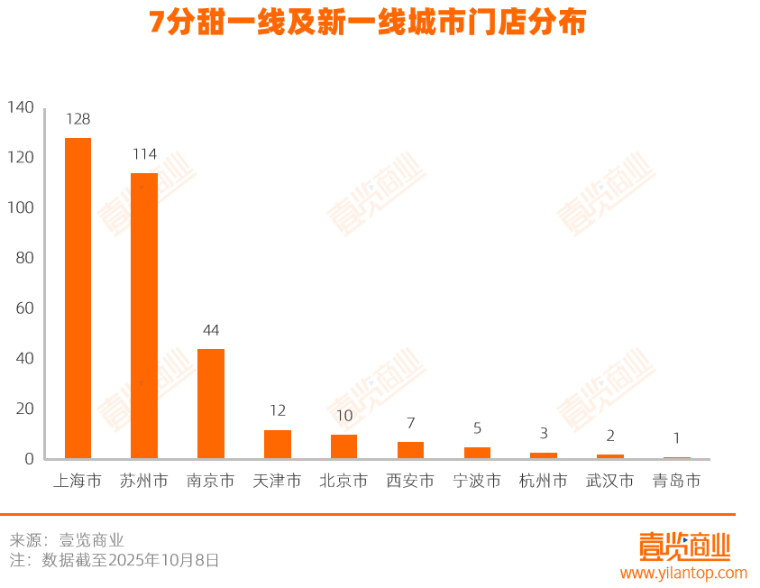 然而,7分甜尚未完成对新一线城市的全覆盖。全国15座新一线城市中,品牌仅进入8座,成都、重庆、长沙、沈阳等高潜力城市仍为空白。即便在已进入的城市中,除苏州、南京外,其余城市门店数普遍不足10家,未形成规模效应。