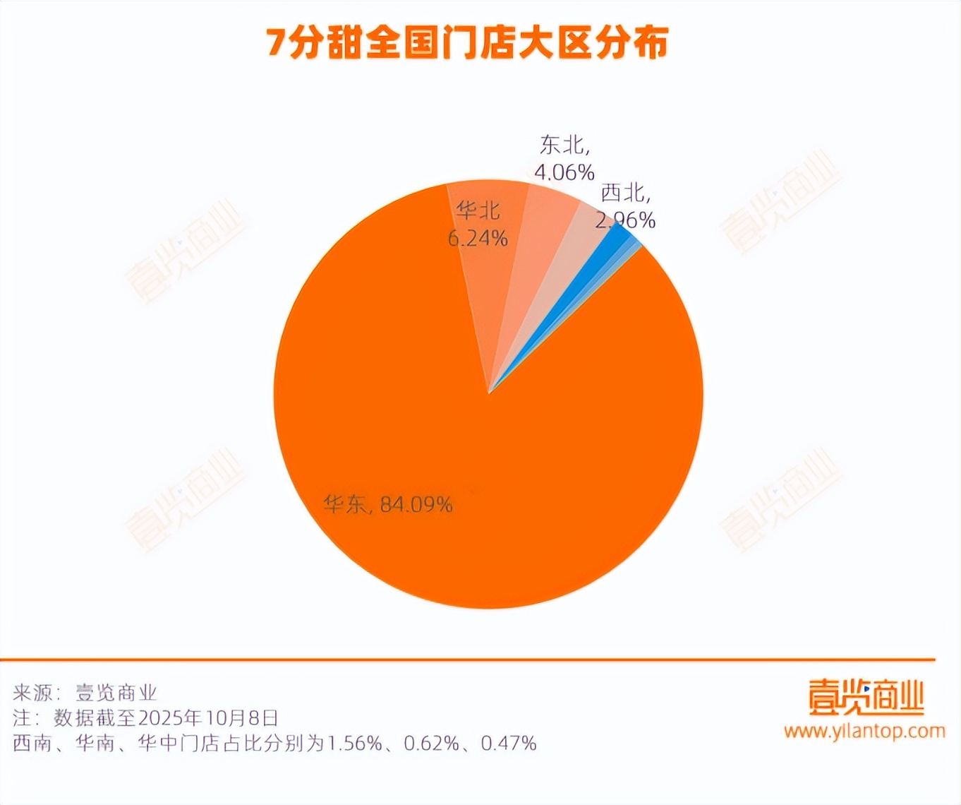 壹览商业数据显示,7分甜在华东区域共开设了539家门店,占全国总门店数的84.1%。紧随其后的华北区域拥有40家门店,占比为6.2%;东北、西北与西南三大区域的门店占比均低于5%,而华南与华中区域占比尚不足1%。