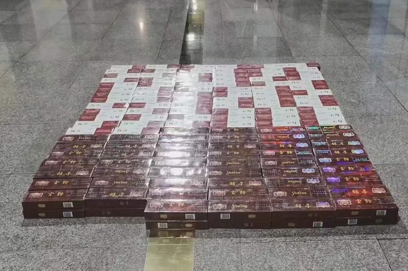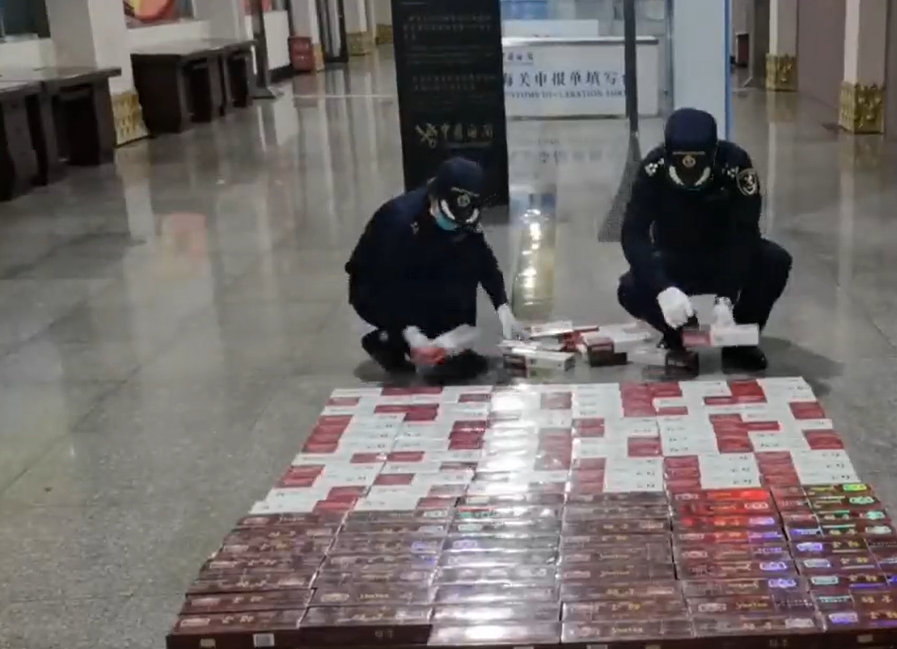 经进一步检查,从该大巴车空调口上方夹层中查获未向海关申报的香烟一批,共计248条,49600支。