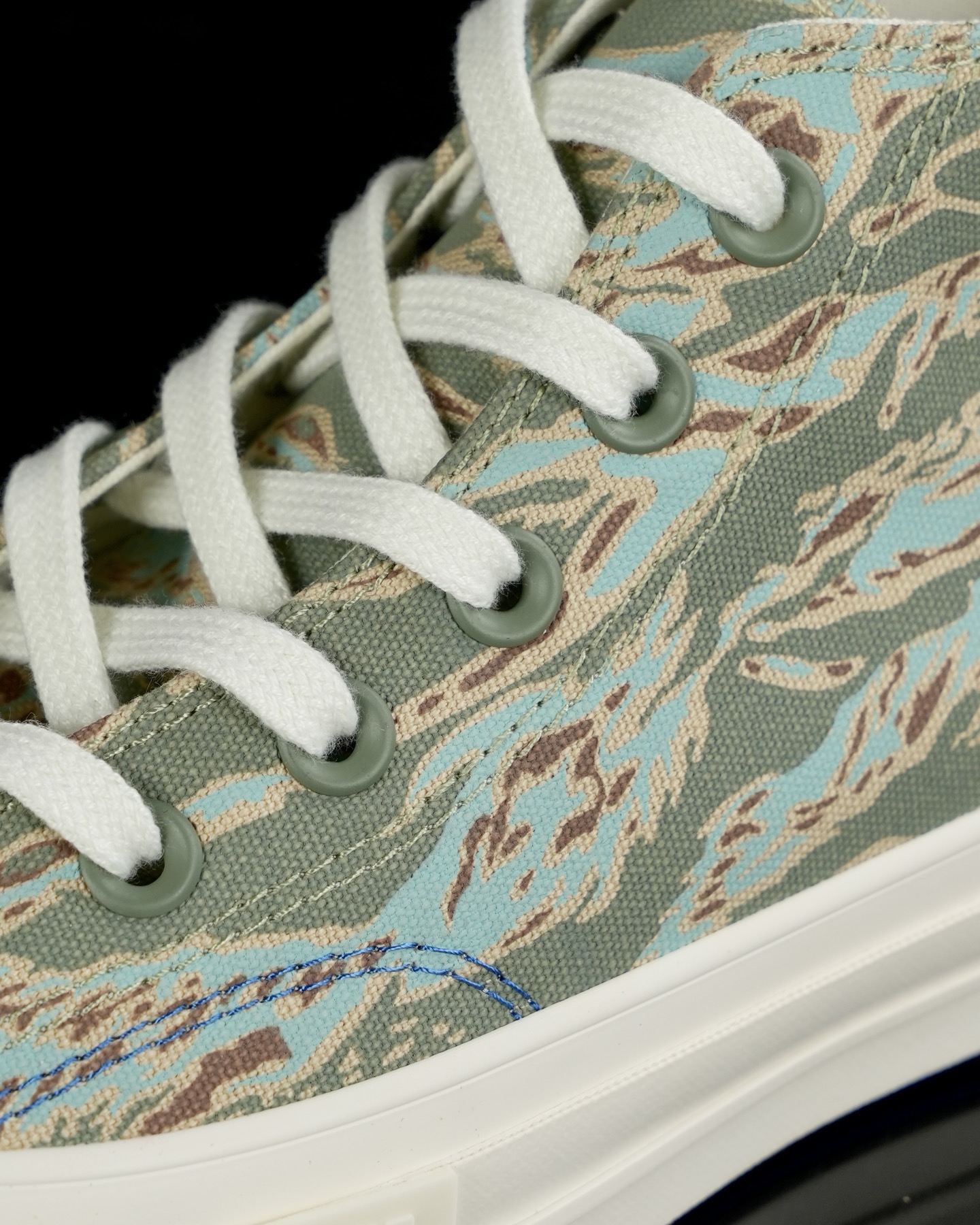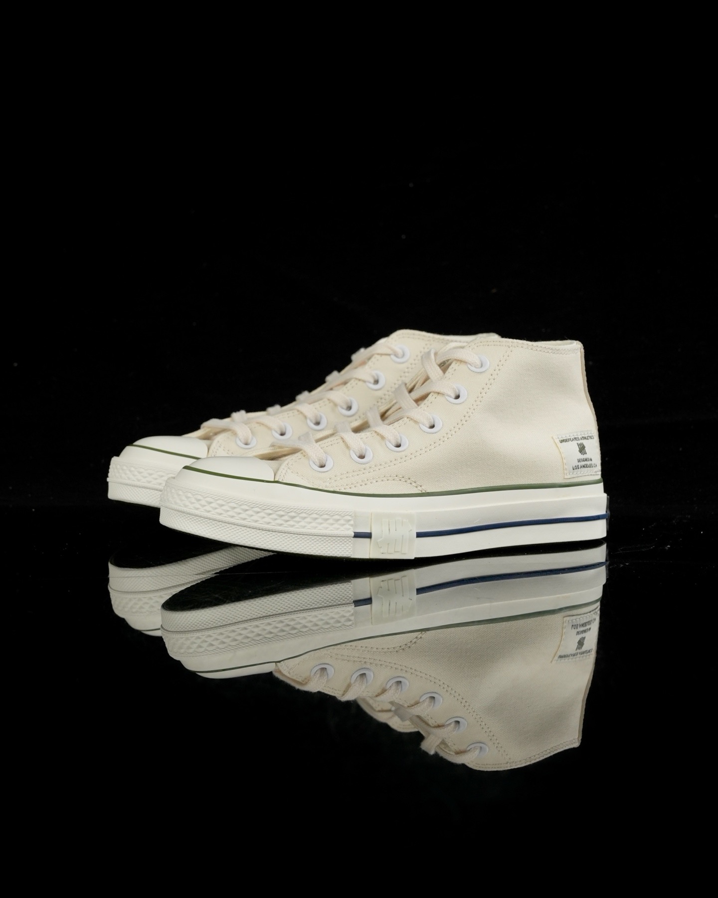 鞋款采用Chuck 70 Mid 鞋型进行设计,在高帮与低帮中找到舒适与美观的平衡点,并沿袭前作中的UNDEFEATED标志性美学,再搭配鞋舌与后跟标处的5-Stike Logo编铭牌,联名标志处处可见,营造联名氛围之余更将质感拉满。