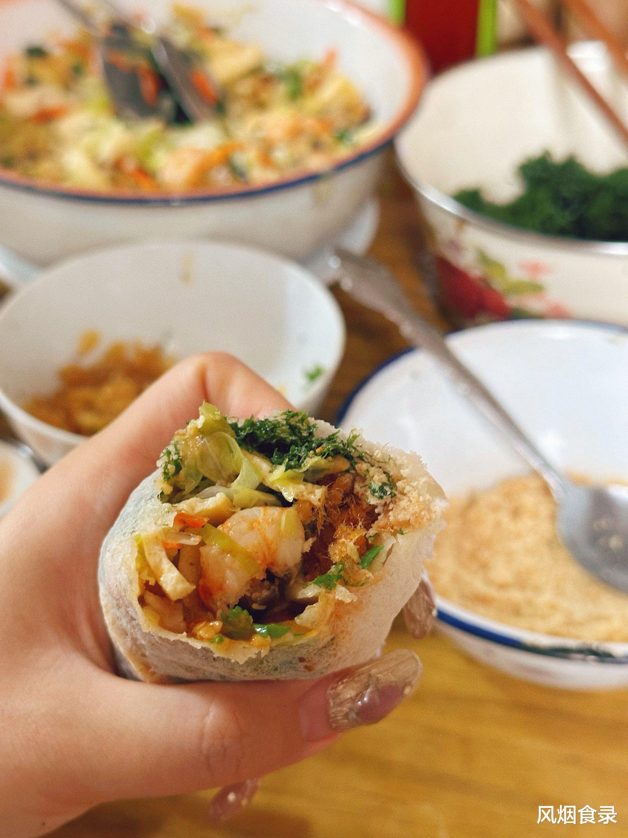 薄饼皮薄如蝉翼,透光能见指影,裹着虾仁、香菇、高丽菜、糯米饭,蘸甜辣酱咬下,鲜甜咸香“轰”地炸开舌尖。