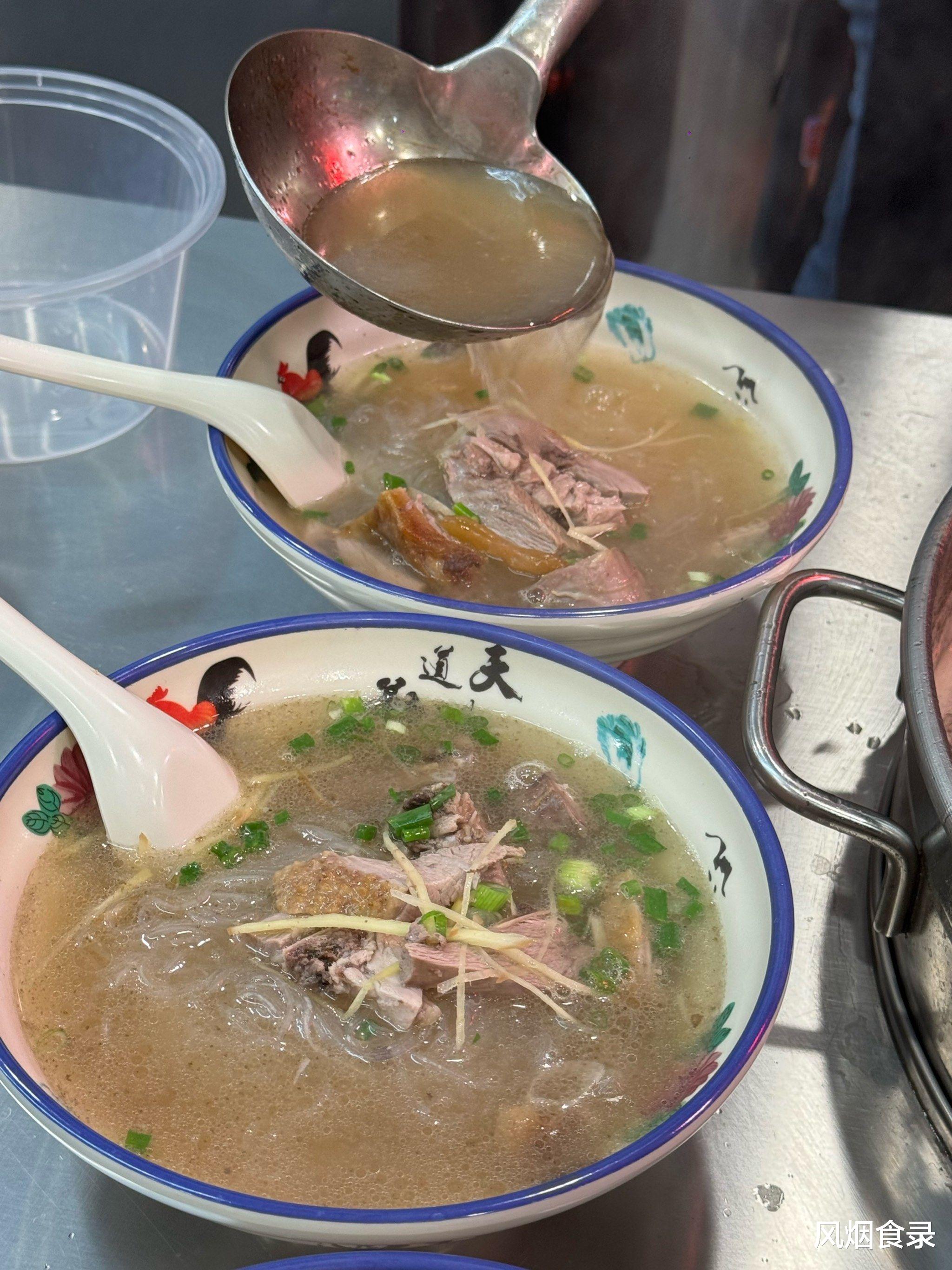 汤得用土番鸭架文火熬足十小时,汤色清得透亮,面上浮层薄鸭油,喝口鲜得眉毛掉。
