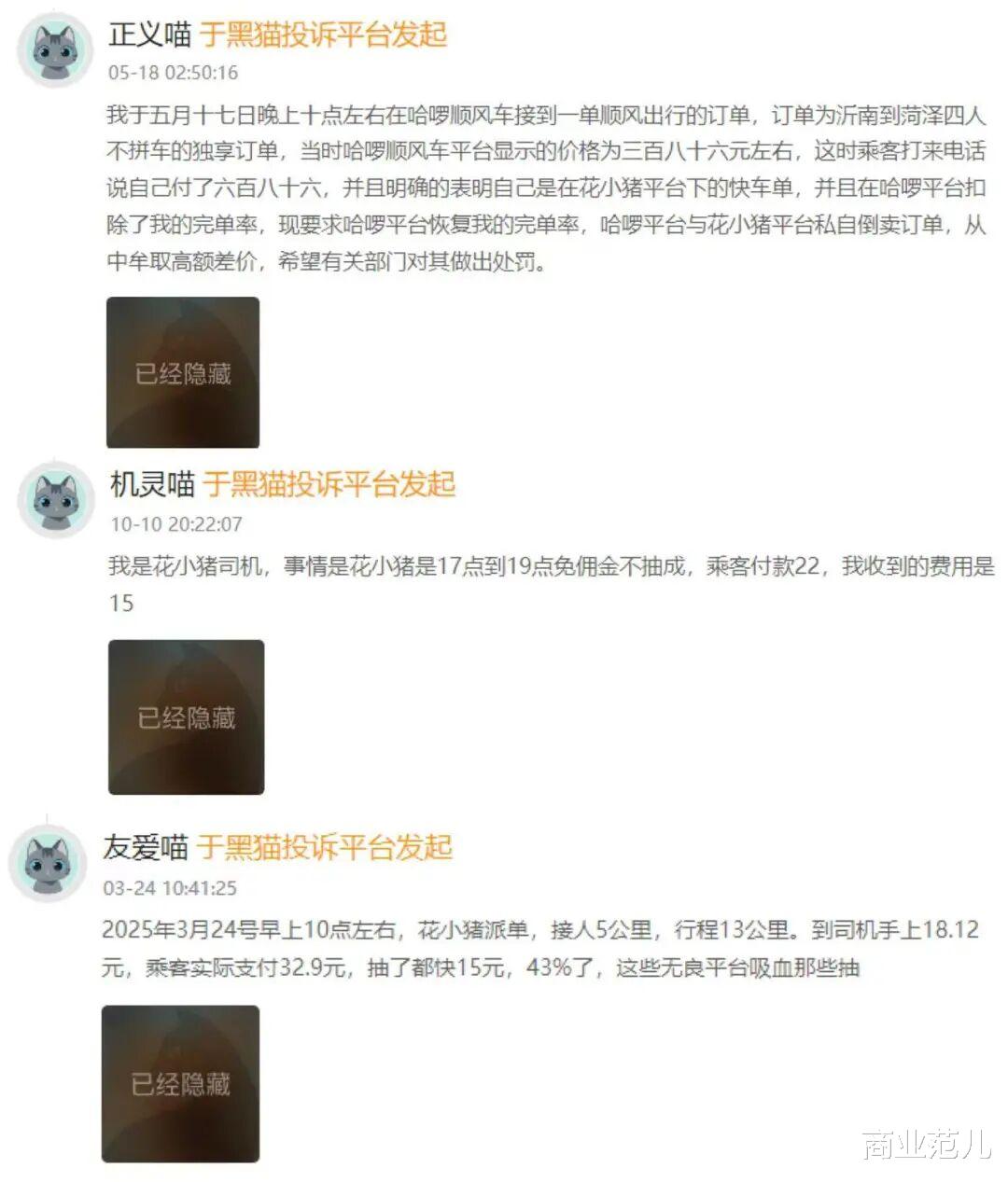 从行业现状看,破局的关键在于强化监管穿透力。目前,西安、开封、鹰潭等多地已叫停“一口价”订单,聚合平台被要求将抽成上限控制在27%,但更需建立长效机制。唯有如此,才能终结司乘双输的博弈困局,推动网约车行业回归服务本质。(图源:微博、黑猫等平台)