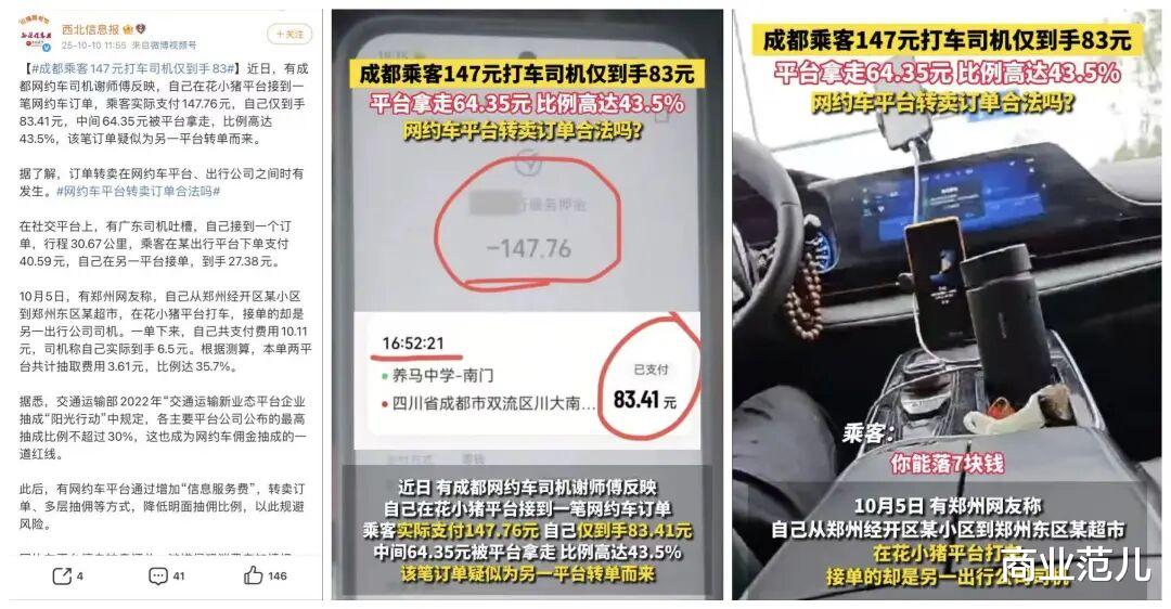 在30%抽成比例成为网约车行业公认隐形红线的背景下,一种通过跨平台转单实现的“分拆式抽佣”模式正悄然出现。据多地司机发布的订单信息显示,乘客实际支付费用与司机最终到手收入间存在明显差额,部分订单综合抽佣比例已突破40%,甚至达到50%。