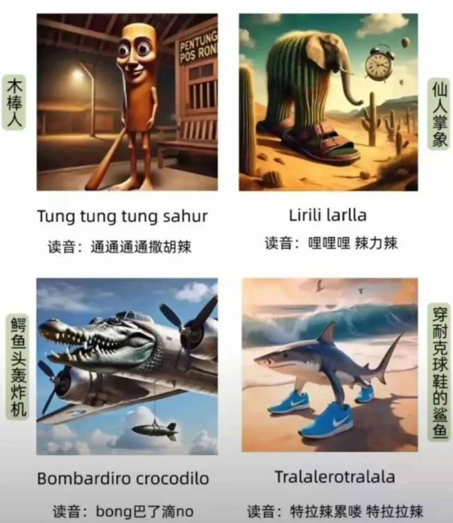 穿着球鞋的鲨鱼、手持木棍的木头人、长着大鹅脑袋的轰炸机……这些违背常理的奇怪形象由AI生成,名字大多由英文、意大利语变形组合而来,没有任何实际意义,因此被国外网友称为“脑腐”,意思是对大脑没有价值,影响思维能力。