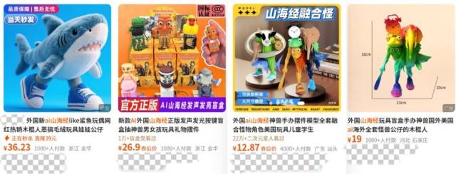 记者留意到,在一些电商平台上,搜索“外国山海经”会自动关联出大量相关词条。除了以这些AI动画形象为原型制作的玩具、手办外,还有文具、漫画书、生活用品等等,不少商品页面显示“已售10万+”。一些学校周边的文具店、超市、玩具店,也有“外国山海经”相关玩具在售。