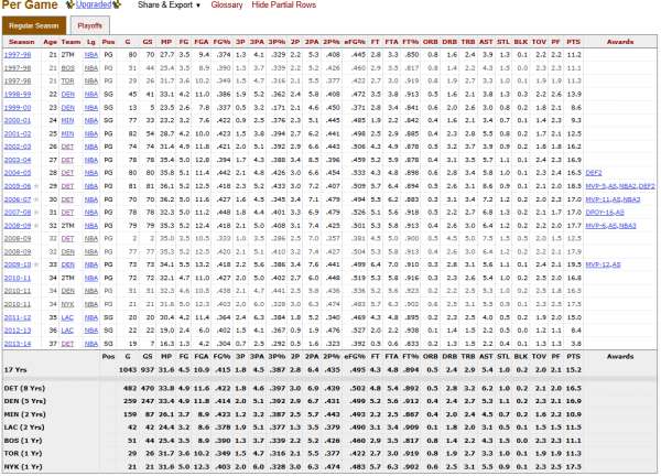 常规赛出战1043场比赛,场均出战31.7分钟,得到15.2分2.9篮板5.4助攻1抢断,三项命中率41.5%+38.7%+89.4%。