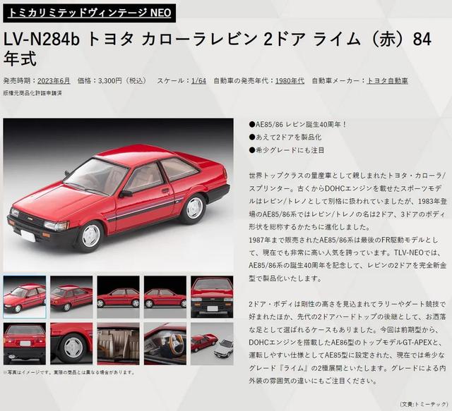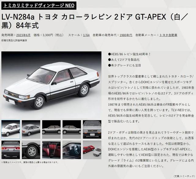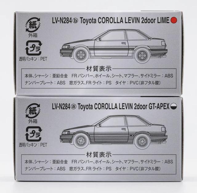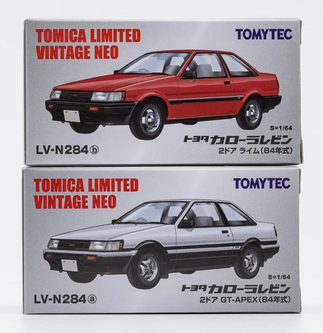 这次试玩的两款模型是Toyota AE86 Levin车型,编号LV-N284ab,产品于2023年6月上市,分别是经典黑白色的GT-APEX车型和红色的LIME车型;相对于39块的DCT,TLV的外形更准确、细节更丰富、整体表现稳得一笔,综合品质也不错,尽管价格100出头,比DCT贵不少,但是相对来说更值得收藏,而且二手市场表现也比较稳定,理财产品说不上,但基本保值还是能做到的。