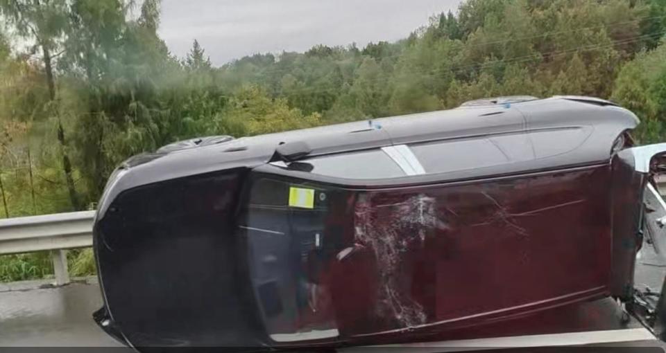 视频显示,高速路护栏被撞断,有车辆翻在路边,还有车辆侧翻在护栏外。
