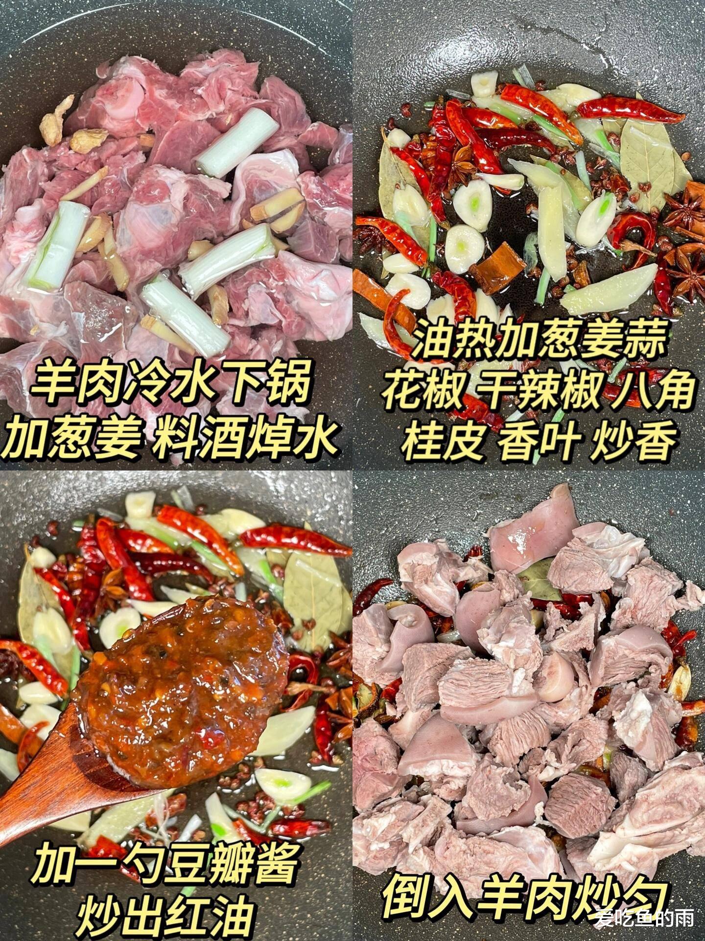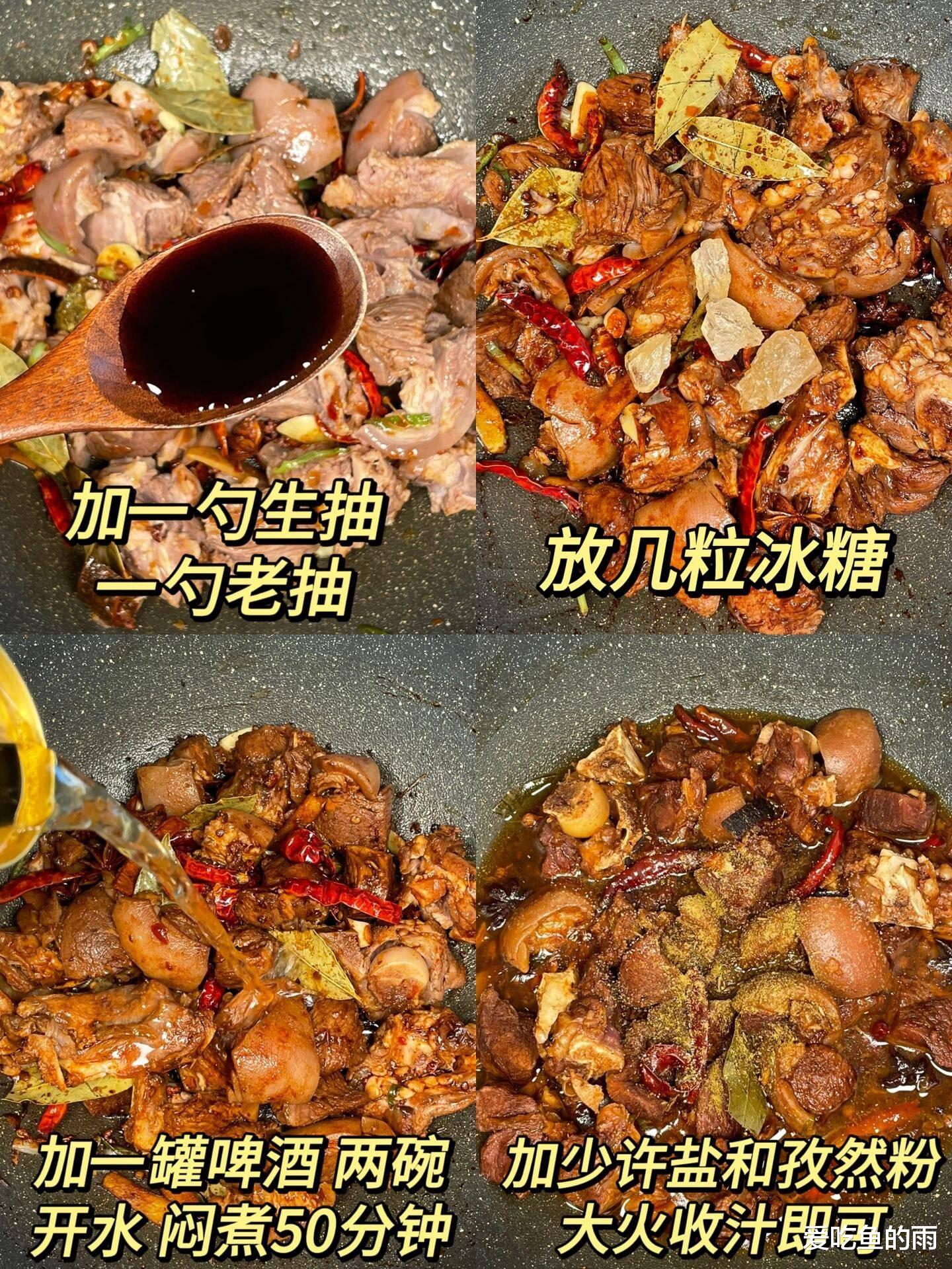 烹饪过程像场火候的艺术。羊肉先冷水下锅焯水,撇去浮沫后捞出,热锅凉油下冰糖炒出糖色,再放羊肉翻炒裹上色,接着加姜片、八角、桂皮爆香,倒入没过肉的热水,放生抽、老抽和那勺灵魂腐乳汁。大火烧开转小火慢炖一小时,最后加盐收汁。记得有次我急着吃饭,没炖够时间就关火,结果肉硬得塞牙,被老爸笑话“这是练牙口呢”。现在我学乖了,宁愿多炖半小时,也要等到筷子能轻松扎透肉皮才罢休。
