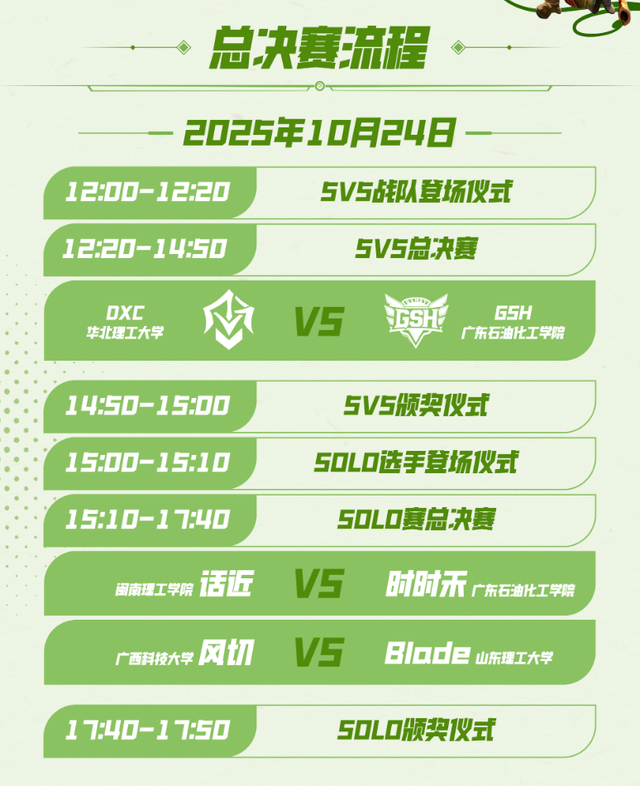 10月24日12:00 - 15:00,5V5总决赛将率先打响,DXC战队(华北理工大学)与GSH战队(广东石油化工大学)这两大顶尖高校战队将在召唤师峡谷展开一场巅峰对决,采用Bo5赛制。这两支战队在之前的比赛中一路过关斩将,展现出了强大的实力与团队默契。他们究竟会为我们带来怎样精彩绝伦的团战与战术博弈?谁又能在这场强强对话中更胜一筹,捧起冠军奖杯,赢得40000元现金奖励呢?让我们拭目以待!