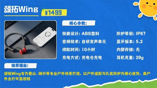 颂拓Wing是一款专为登山、骑行等户外场景打造的骨传导耳机,以超强的户外适配能力与扎实的防护性能为核心优势,是户外出行的可靠搭档。