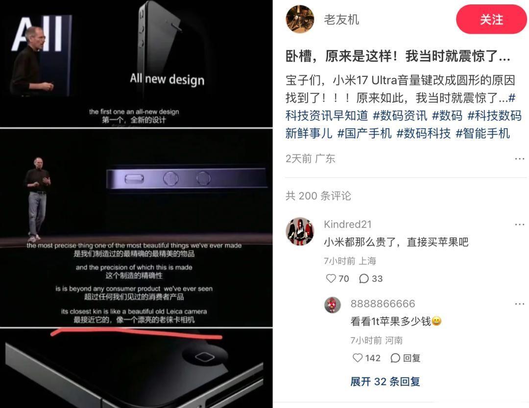 手机拿在手上,能看到从屏幕到镜头、再到手机壳每个细节都被Leica元素反复包裹,让徕卡信仰粉难以抗拒。如果不是不能自己换镜头,说它是能打电话的数字徕卡也没啥毛病。甚至连变焦方式,都用上了手动拧环,弄得跟玩单反一样有仪式感。音量键变成了圆形,很有点iPhone 4时代的风格复古,小米这番设计直接唤起老果粉的记忆,不少人点赞这种情绪价值。