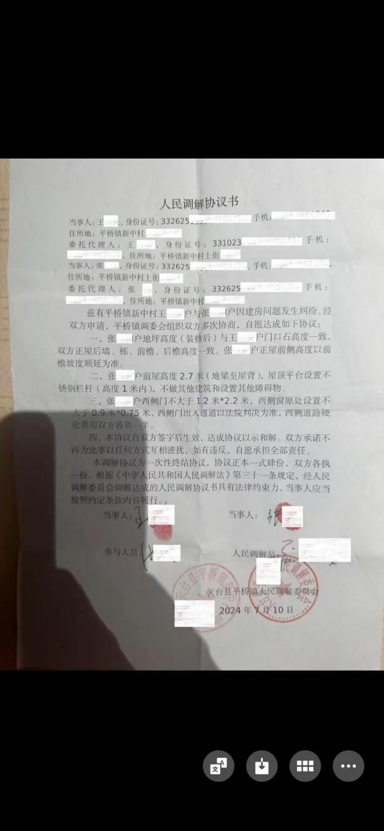 2024年7月10日,经平桥镇人民调解委员会介入,王女士与张某签订《人民调解协议书》,该判决被天台县法院认定有效,约定张某父亲户建房高度、门窗尺寸需与王女士父亲户保持一致(单层楼房),且西侧道路硬化费用双方共担 。