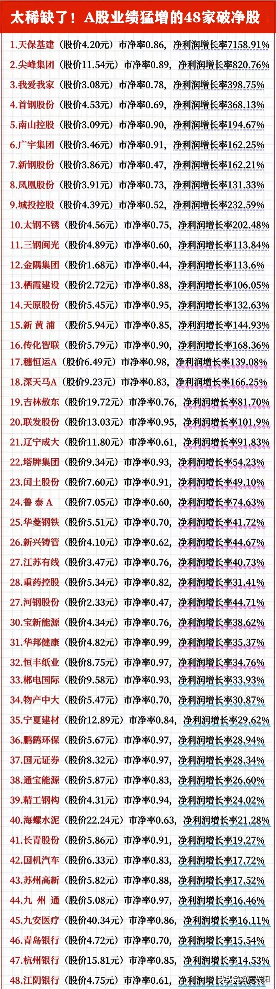 阳哥汇总了一下,目前A股业绩猛增的破净股共有48家,其详情如下: