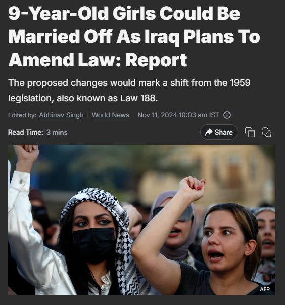 在这个全球共同努力为女性赋权、推动性别平等的时代,伊拉克却传出了一则令人震惊的消息:该国正准备通过一项新法律,将法定同意年龄从18岁骤降至9岁,这一举措无疑在全球范围内引发了轩然大波。伊拉克拟将女性法定结婚年龄降至9岁的消息,迅速在网络上发酵,并被指责将使儿童强奸合法化,让无数人的心为之颤抖。
