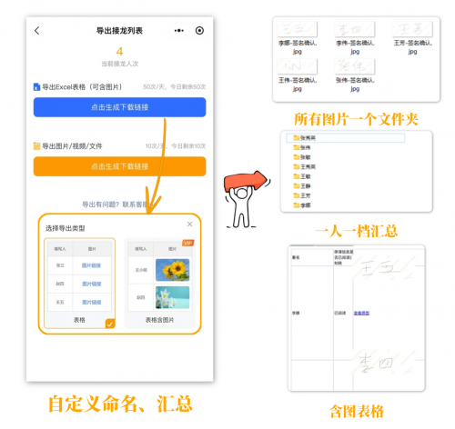 接龙结束后,数据自动汇总,可将所有提交信息一键导出为Excel或压缩包,不管是存档备用,还是整理成汇报材料给上级,都能轻松搞定,让工作汇报有据可查。