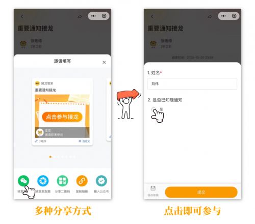 发布接龙后,一键分享到群或企微即可,整个过程不到 1 分钟。