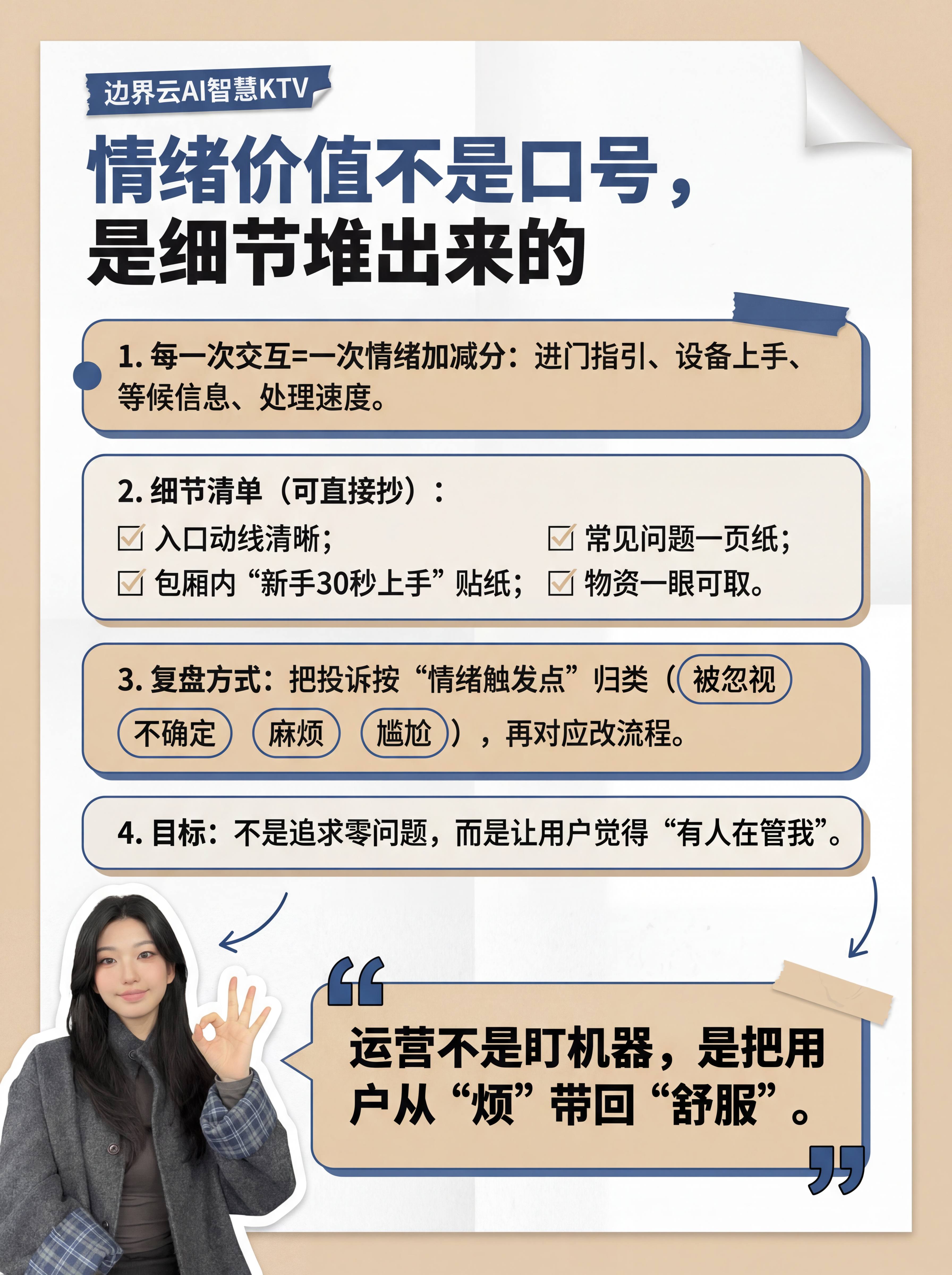 八、给KTV运营者的3条建议建议1:记录"情绪",不只是"问题"不要只记录"空调坏了"、"音量小了",要记录背后的情绪:
