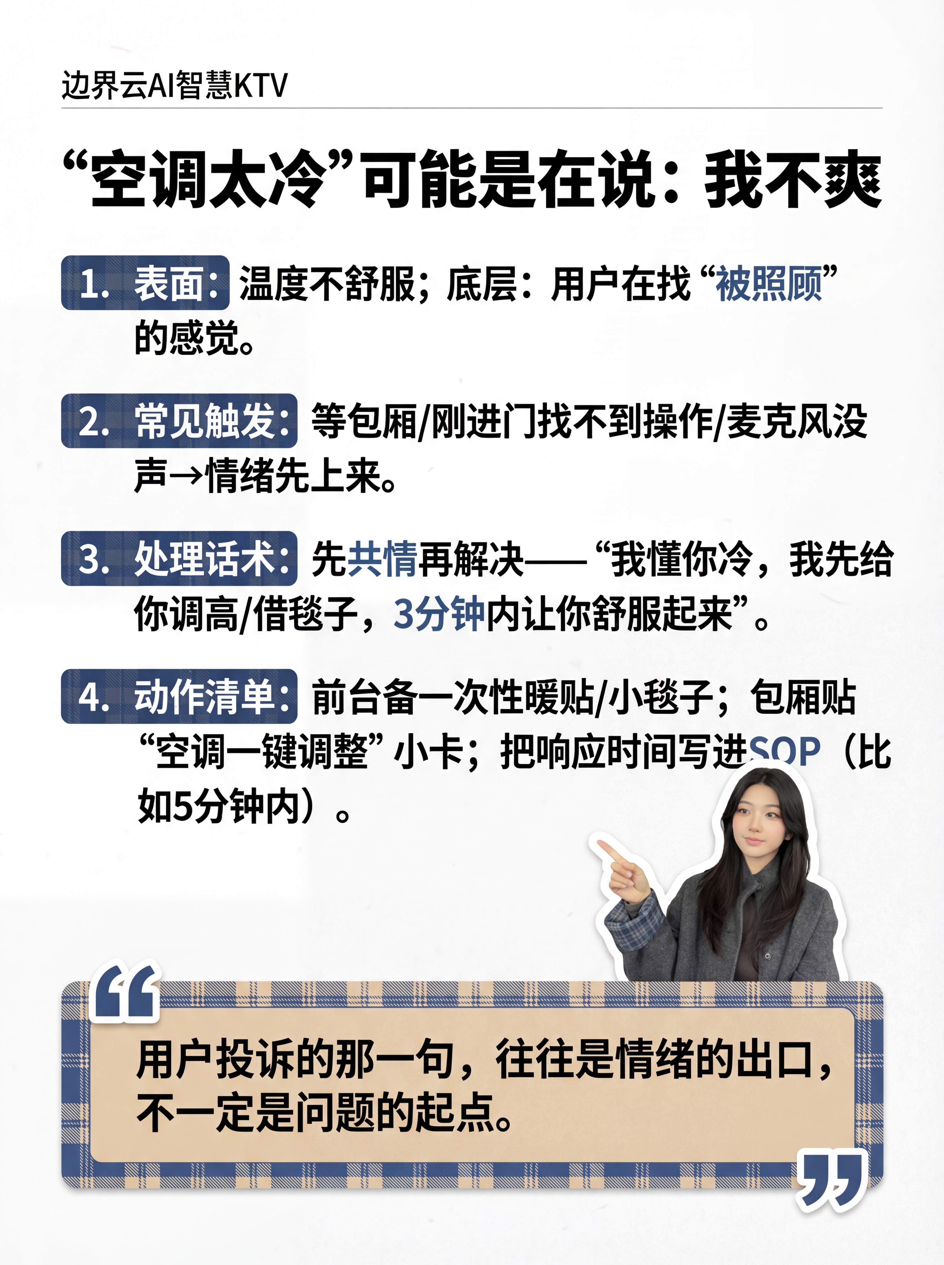 处理话术:先共情再解决——"我懂你冷,我先给你调高/借毯子,3分钟内让你舒服起来"