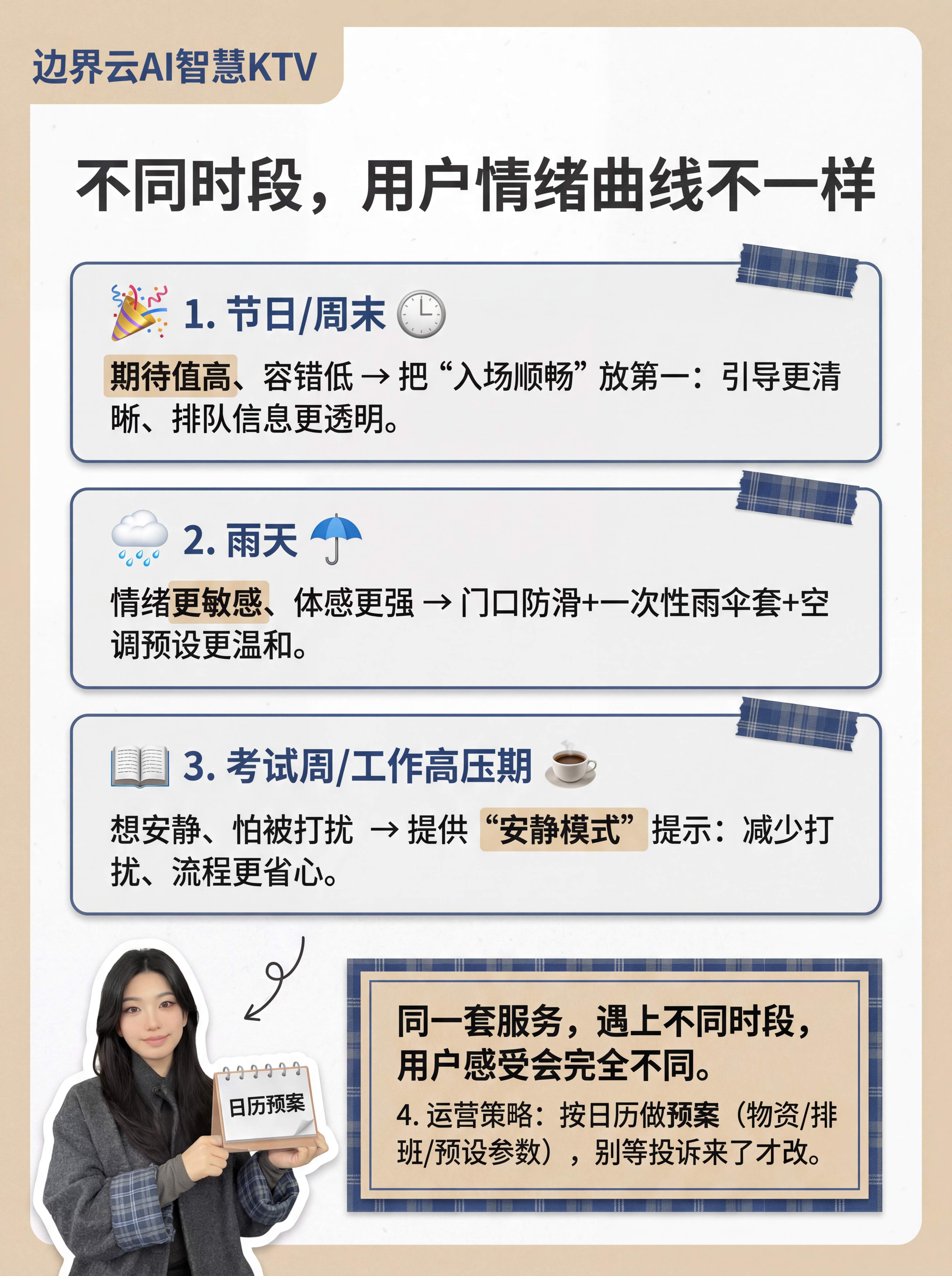 建议2:按时段做运营预案节日、雨天、高压期的用户情绪完全不同,不能用一套服务标准。提前准备物资、调整排班、优化预设参数。
