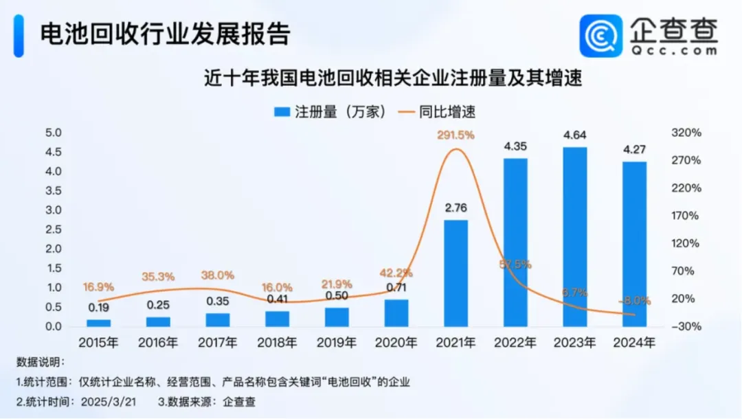 这些退役电池被称为蕴含锂、钴、镍等战略资源的“城市矿山”,吸引着大量资本和企业涌入。企查查最新数据显示,我国现存动力电池回收相关企业17.2万家。近10年来,这一领域的企业注册量呈持续增长态势。