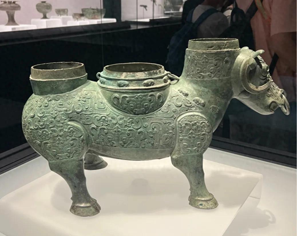 上海博物馆的这件牺尊是春秋晚期的青铜器,花纹华丽对称,牛腹中空,牛颈和背脊上有三个孔,两边的孔用来注入热水,而中间一孔上是一个有环的温酒器,容器的顶上还有三个防止温度丧失的盖子,但可惜三个盖子都已遗失。
