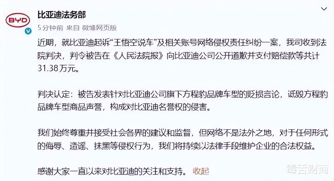 11月 20 日,比亚迪法务部发布公告披露,法院经审理认定,被告(王悟空说车)发表针对比亚迪旗下方程豹品牌车型的贬损言论,已构成对企业名誉权的侵害,最终判决被告向比亚迪支付共计 31.38 万元赔偿款,同时判令被告在《人民法院报》向比亚迪公司公开道歉,自此,比亚迪起诉自媒体账号 “王悟空说车” 及相关主体的网络侵权责任纠纷一案终于尘埃落定。