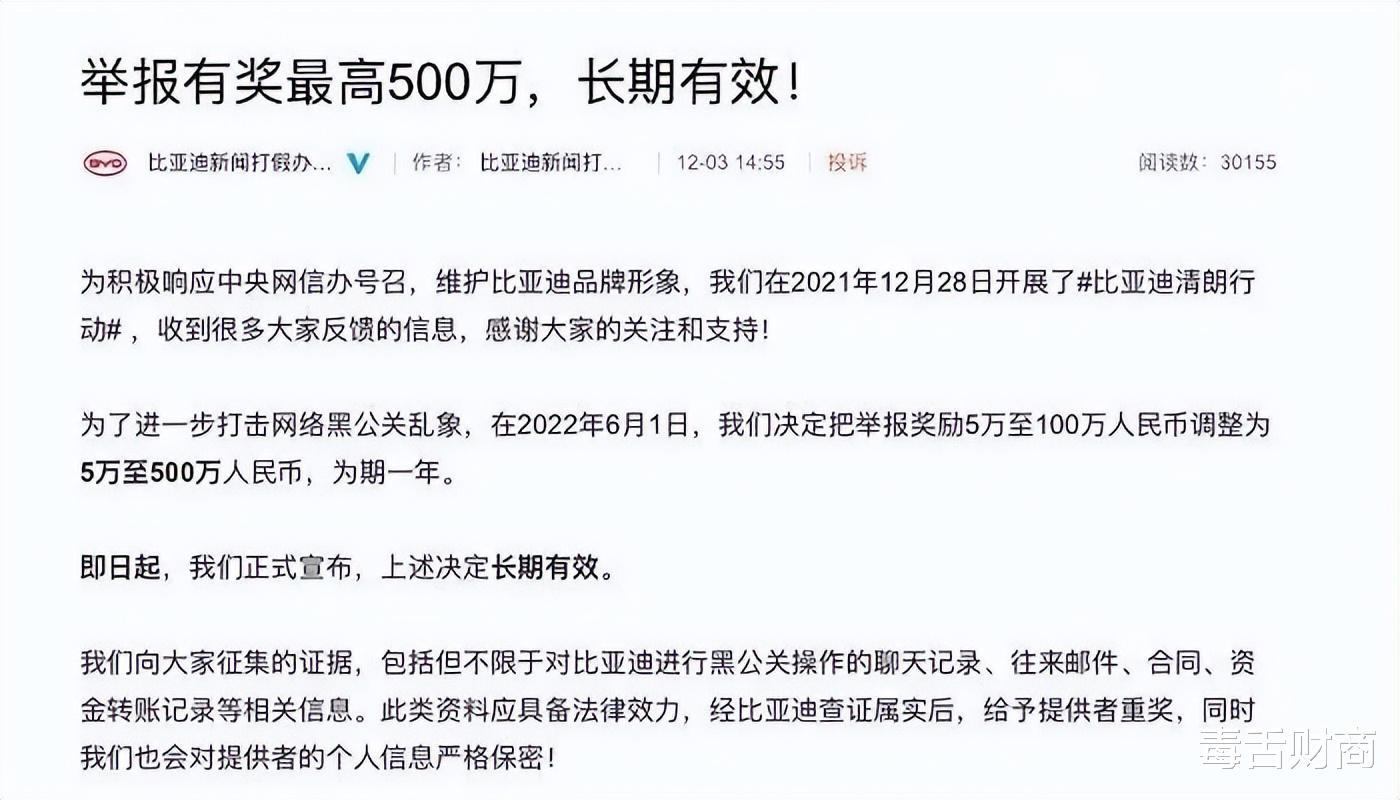 对此,比亚迪也是忍无可忍,并推出了一个专项整治黑嘴的行动,早在2021年,比亚迪就宣布悬赏5万—100万打击黑公关,为加强这一行动的效果,2022年,比亚迪又将举报奖励进一步提升至5万至500万元人民币,在重奖之下,很多热心的网友都纷纷提供了一些有价值的线索,很多黑比亚迪的博主也因此露出了马脚。