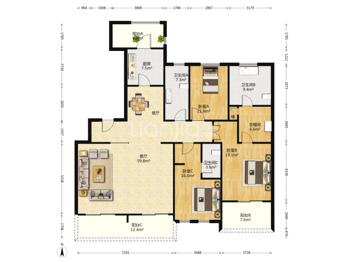 190.03㎡做3房2厅3卫,主要功能间及近7.5米面宽的超大横厅均朝南,空间阔绰,采光通风极佳。
